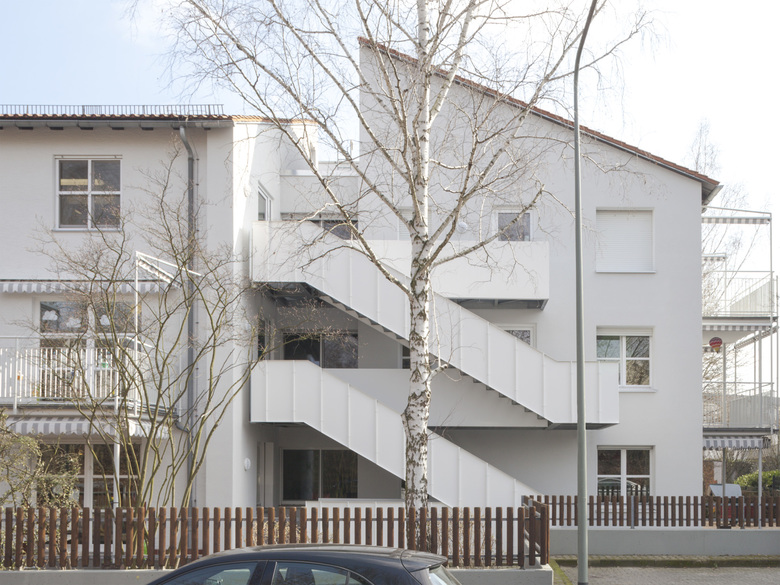 Nach außen zeigt sich die Brandschutzsanierung durch den Anbau einer prominent weißen Treppenskulptur an der Straßenfassade. Spiralförmig und stützenfrei verbindet sie mit architektonischer Leichtigkeit sieben Gruppenräume bzw. -bereiche über vier Geschosse vom Keller bis unters Dach. In einer selbstverständlichen Form integriert die neue Fluchttreppe die komplexen Anforderungen an die Treppensteigung, die Treppen- und Podestbreiten, die Treppenbrüstung, die Handlaufhöhen und die Lage der anzudienenden Fenstertüren.