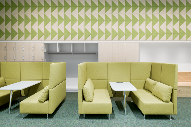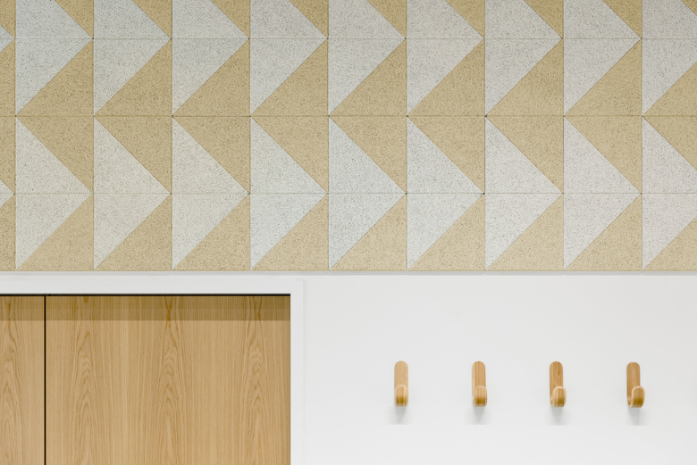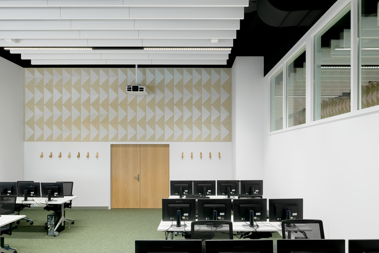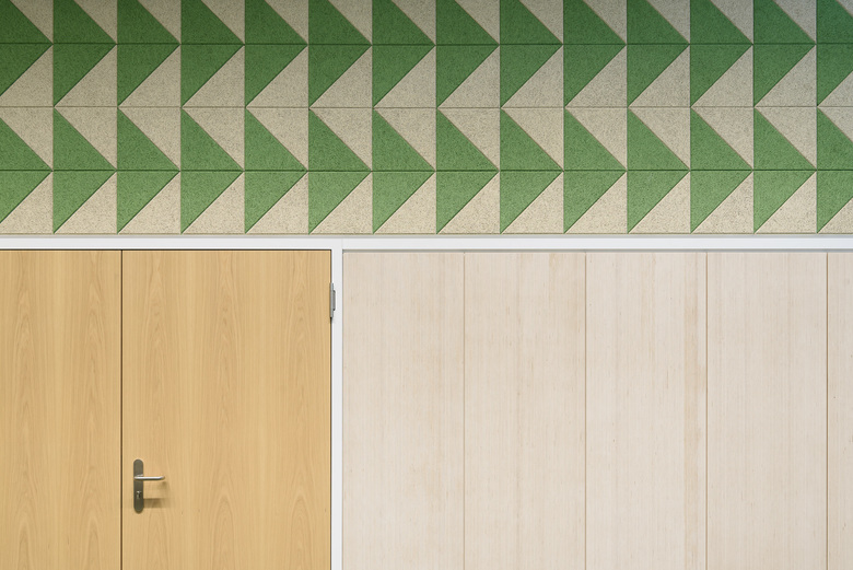 Durch hochwertige Eichen-Doppelflügeltüren hindurch bildet der grüne, farbintensive Kugelgarnboden einen Ringschluss zwischen den drei gleichgroßen Räumen. Selbige verbindende Raumwirkung haben wandgroße Grafiken aus naturbelassenen und gefärbten Holzwolle-Akustikpanelen und Deckenfelder aus weißen Akustik-Buffeln, welche die offenen, schwarzen Technikdecken horizontal begrenzen. Sie sind aus den Nachbarräumen erlebbar und erzeugen erweiternde und belebende Durchblicke.