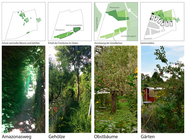 Die GünthersburgHÖFE entwickeln ihre Identität durch das besondere Freiraumelement der GartenWILDNIS. Auf einer Fläche von ca. 24.000 qm werden hier wichtige identitätsprägende Landschaftselemente erhalten, wie wertvolle Gehölz- und Baumbestände und artenreiche Biotop- und Bodenstrukturen. Die GartenWILDNIS bietet einen Aktionsraum für bereits hier verortete und neue Gemeinschaften. Die im Bestand separaten Anlagen Günthersburgpark, Wasserpark und Hauptfriedhof werden zu einem kontinuierlichen landschaftsökologischen Grünraum vernetzt.
