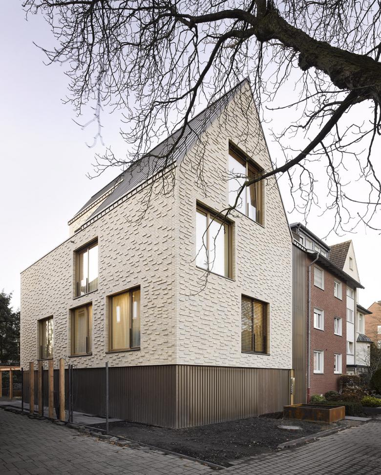 Gebäudeform und Fassadengestaltung orientieren sich in abstrahierter Form an der Nachbarbebauung. Die Giebelform des Daches wird aufgenommen, das Dach dreht sich zugleich in Richtung des angrenzenden Reihenhauses. Auch der Klinker nimmt die Farbigkeit der beigen Putzfassade auf. Der Gebäudesockel springt in gleicher Ausbildung zurück. Die Materialität besteht aus natursteinfarbigem Klinker und Fassadenblechen.