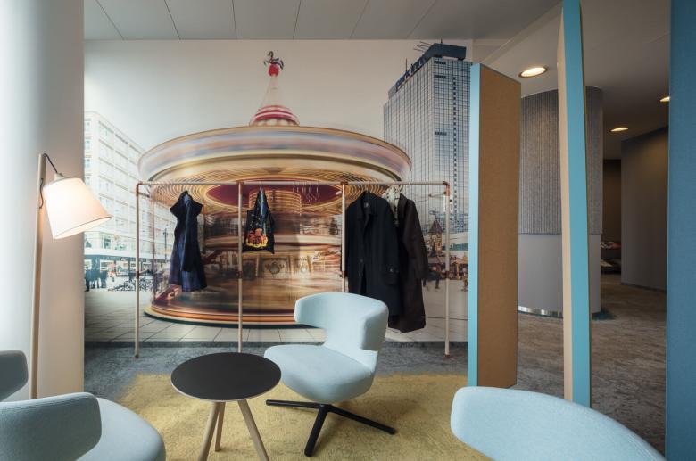 Die Arbeitsplätze des Open Space Office bei Ernst & Young Berlin ordnen sich entlang der großzügig belichteten Fassade. Durch die strategische Neupositionierung von Räumen und den Einsatz multifunktionaler Raumtrenner für visuelle und akustische Abschirmung, Garderobe oder Stauraum wird das Großraumbüro in optimale Gruppengrößen unterteilt. Die Mittelzone lockert sich zugunsten der Wegeführung auf. Hier findet Kommunikation statt. Wiedererkennungsmerkmal der Sonderzonen ist der bereits im Büroraum angedeutete farbige Teppichverlauf. Berliner Style und Gemütlichkeit werden durch das Zusammenspiel eines wiederkehrenden Farbschemas in verschiedenen Texturen und „roughen“ Oberflächen erzeugt.