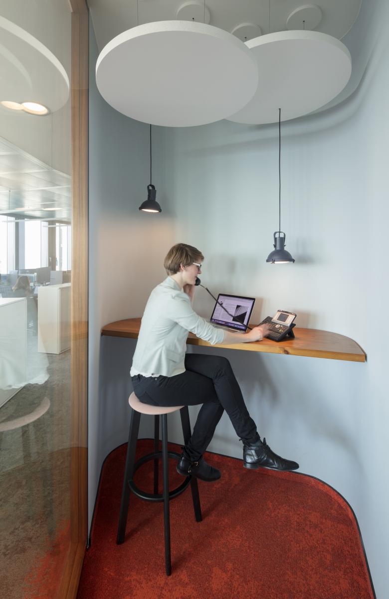 Die Architektur zahlt mit aktivitätsbasierten statt fest zugewiesenen Arbeitsplätzen auf die agile Arbeitsweise des international tätigen Beratungsunternehmens ein, dessen Mitarbeiter*innen ständig in den Büros ihrer Kund*innen auf der ganzen Welt unterwegs sind. Statt verwaister Schreibtische bestimmen Flächen für Austausch und Kommunikation das Bild bei Ernst & Young Berlin.