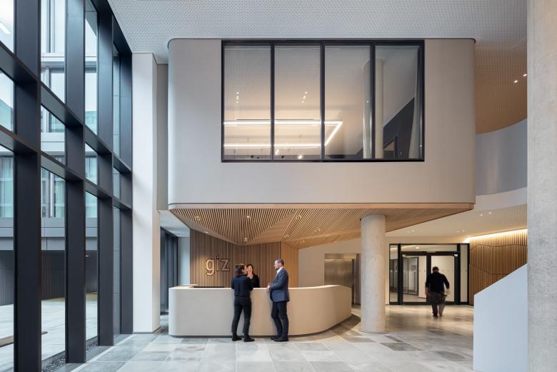 Die Arbeitswelt der GIZ wird auf jeder Etage von einer Kombination verschiedener Raumtypologien für unterschiedliche Arbeitsmodelle und Anforderungen geprägt. Der Schwerpunkt liegt auf soziokultureller Qualität, indem Begegnungen und Kommunikation der Mitarbeiter gefördert werden. Projekt- und Besprechungsräume sowie Co-Labs ermöglichen interaktive Projektarbeit und Teamwork: Mit verschiebbarem Mobiliar und beschreibbaren Wänden sind die Räume flexibel zu nutzen und lassen sich leicht an verschiedene Arbeitssituationen adaptieren. Kreative Arbeitsprozesse finden optimale Unterstützung. Für Monika Lepel ist klar: „Bei der Büroplanung geht es heute nicht mehr darum, einmal alles perfekt aufzustellen und dann unberührt zu lassen. Vielmehr sind Räume als Werkzeuge anzusehen.“
