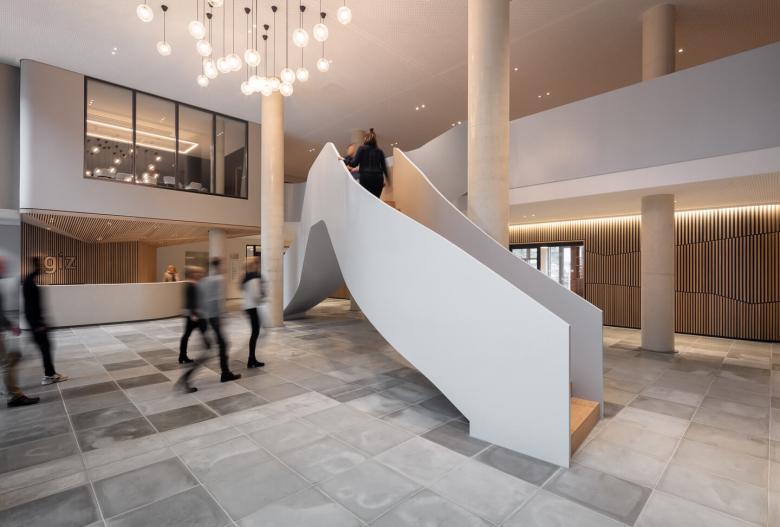 Die GIZ, Bundesunternehmen und Deutsche Gesellschaft für Internationale Zusammenarbeit, errichtete nach höchsten Nachhaltigkeitsstandards einen neuen Campus in Bonn. LEPEL & LEPEL ergänzt den DGNB-Gold-zertifizierten Campus mit einem intelligenten, flexiblen Arbeitsplatzkonzept und natürlichen, meist regionalen Materialien. Eingesetzt wurden authentische, schnell nachwachsende Materialien wie die ikonische Wandverkleidung aus Eichstäben in der Plaza oder Bambusparkett in Projekträumen. Produkte und Accessoires aus Ländern der Projektpartner sind wirken inspirierend und identitätsstiftend und können zudem recycelt werden.