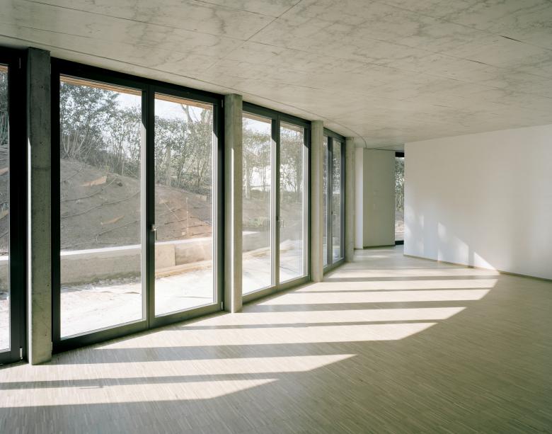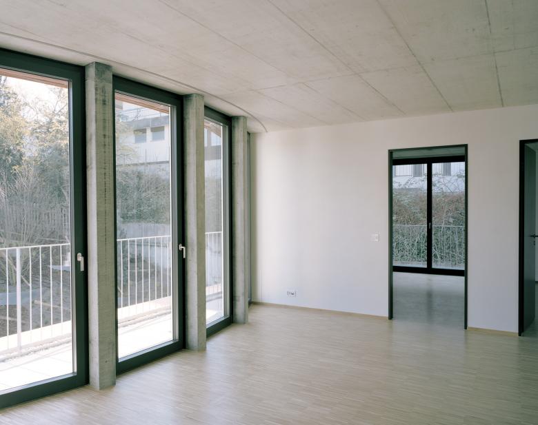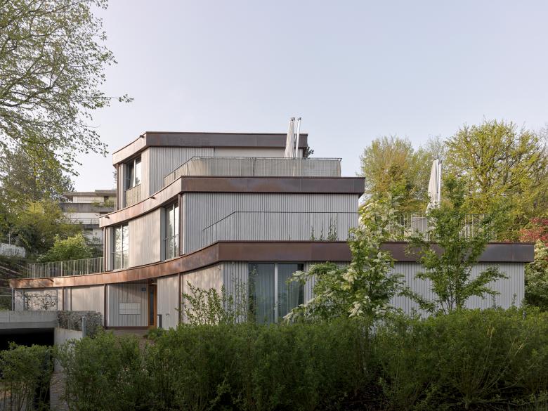Der Ort ist geprägt durch den südlich ansteigenden Hang, welcher durch den Baumbestand und der bestehenden Gebäude die Belichtung einschränkt. Das neue Gebäude nimmt auf diese speziellen Umstände Rücksicht indem es sich weich geformt in die Situation einpasst und sich zu den freien Bereichen der Parzelle öffnet. Das Gebäude verzahnt sich so mit den Bäumen als prägende Elemente des Ortes und schafft dadurch differenzierte Ausrichtungen, welche die notwendige Privatheit für die einzelnen Wohnungen anbieten. Die konkaven Terrassenstrukturen bieten grossartige Aussenräume, welche die Wohnräume nach aussen tragen und deren Grosszügigkeit befördern.