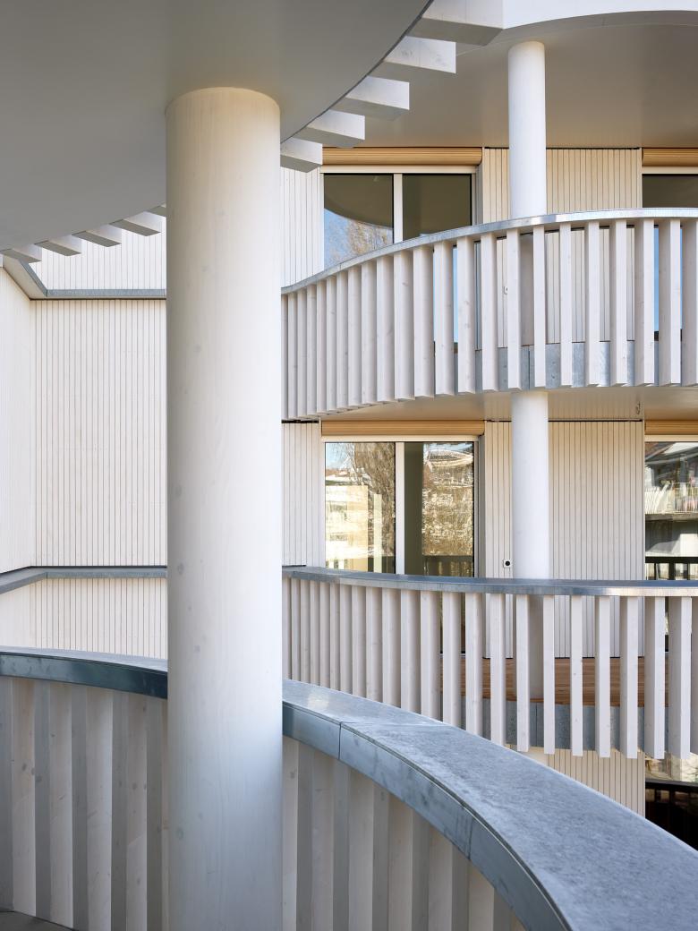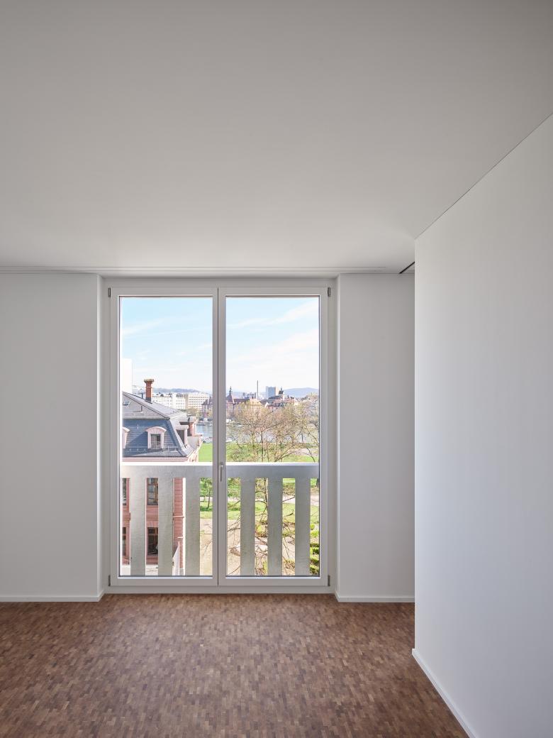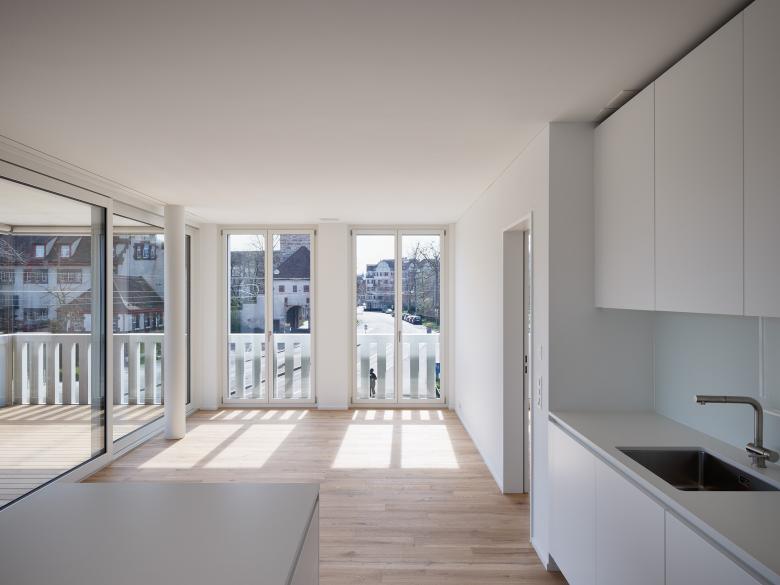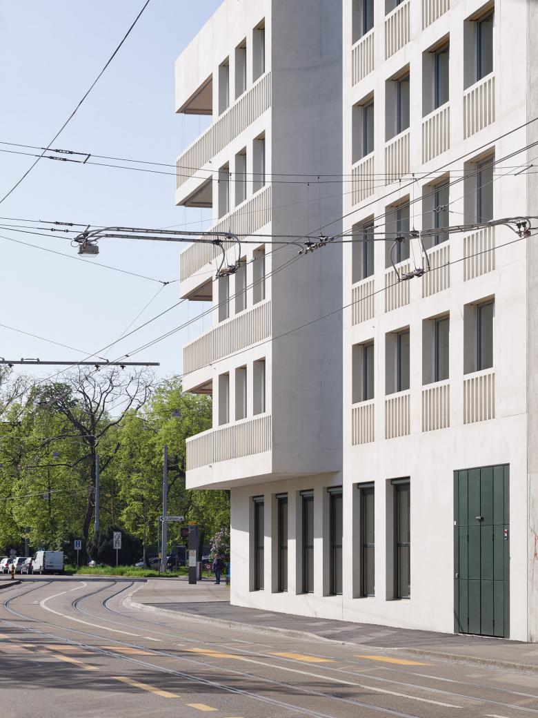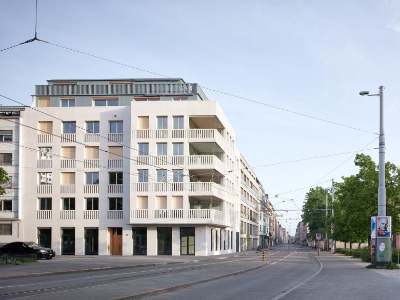 Das vorliegende Projekt markiert die nördliche Ecke des St. Johann-Platzes im Übergang zur Elsässerstrasse und zum St. Johann-Park. Diese städtebaulich wichtige Ecke im Gründerzeit-Blockrand wird über einen differenziert gegliederten Baukörper mit einem präzise gesetzten auskragenden Erker besetzt. Auf der Strassenseite zeigt sich der helle Baukörper als mineralisches Volumen, während er am Dach und im Hof als gegliedertes holzverkleideter Körper in Erscheinung tritt. Die französischen Fenster sind zur Strassenseite über kräftige Geländer charakterisiert und hölzerne Storen zeichnen die gut propotionierten Öffnungen zusätzlich aus, während auf der Hofseite plastisch entwickelte Balkone die besondere innenliegende Ecksituation auszeichnen. Die insgesamt 14 Wohnungen werden durch eine Espressobar und ein Wohnatelier im Erdgeschoss ergänzt, welche mit ihren Nutzungen den Anschluss an den öffentlichen Raum leisten.