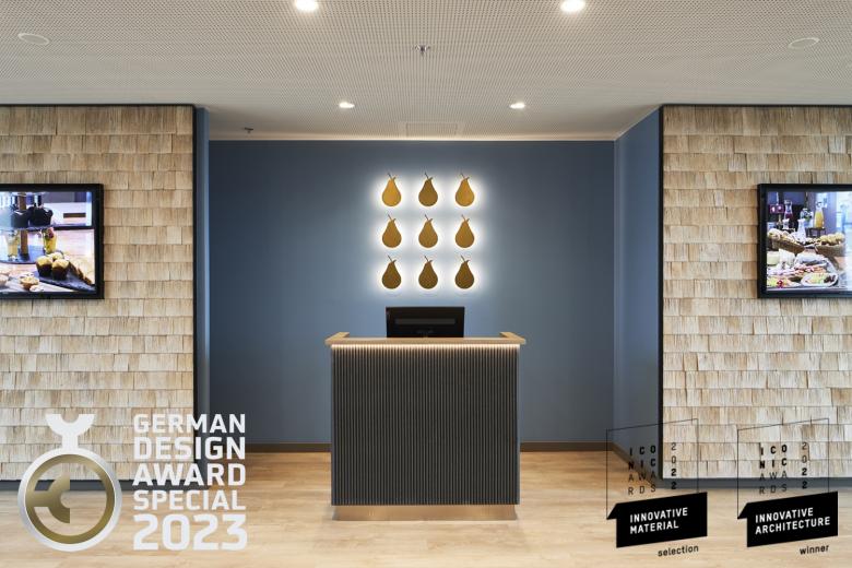 Für eine gute Raumakustik wurden für Vorarlberg ortstypische Materialen als akustische Features eingesetzt: Dazu gehören Schindelwände im Eingangsbereich und am Buffet, sowie die den Booten auf dem Bodensee nachempfundenen Aluminium Deckensegel. Diese wurden speziell für das Top View Restaurant entworfen. Sie heben sich optisch von der dunklen Decke ab, sind akustisch, sowie raumtemperierend wirksam. Für einen guten Umgang mit Ressourcen wurden Produkte und Materialien auf Nachhaltigkeit geprüft.
