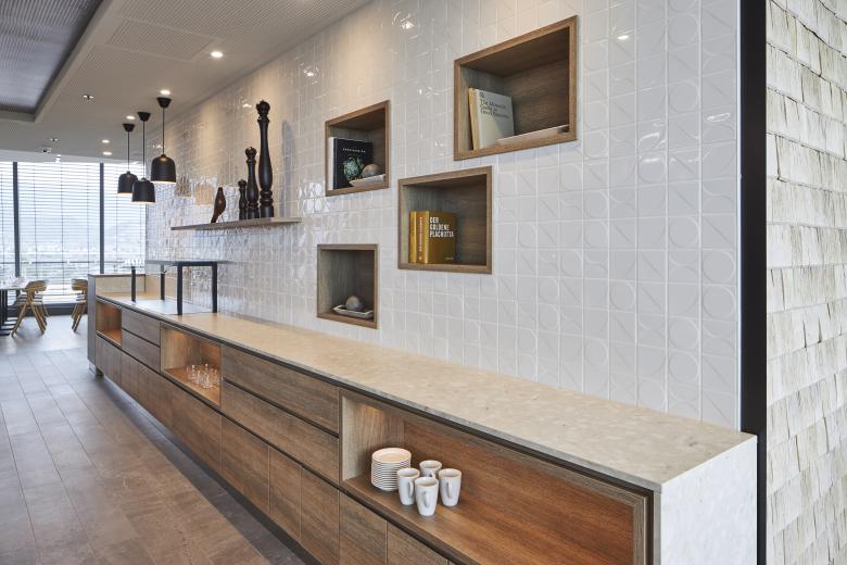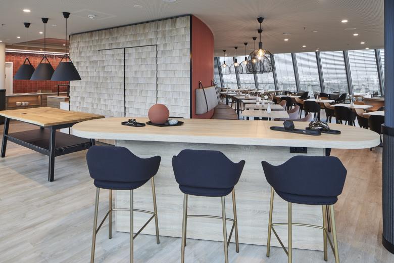 Durch Verlegung der Mitarbeiterkantine, sowie Verkleinerung der Küche wurden neue Flächen geschaffen. Geschickte Öffnungen im Kern des 11-geschossigen Gebäudes und die zentralen Anordnung des Buffets im ovalen Grundriss ließen spektakuläre Sichtachsen entstehen.