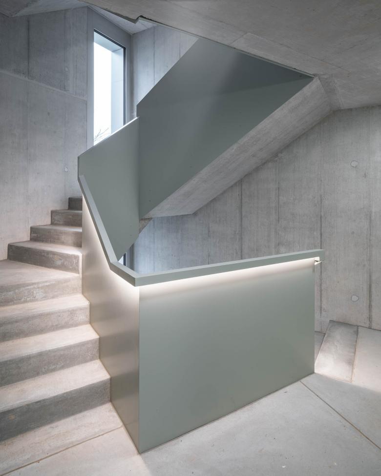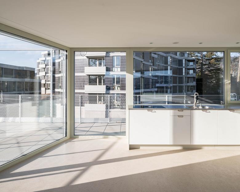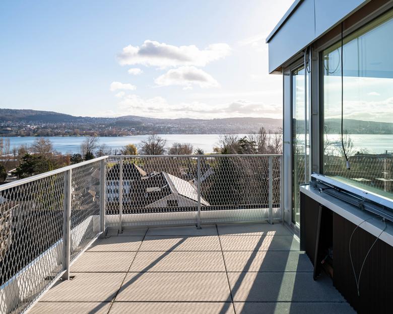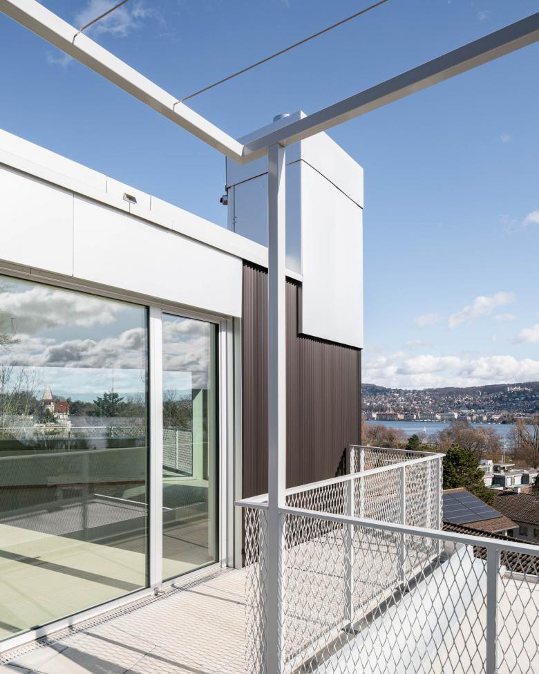 Wie das Relikt einer Schanze schmiegt sich das Haus an die Wölbung des Bellariarains und fächert sich anmutig zur Seesicht auf. Hangseitig betritt man die Hausnummer 5 ebenerdig im zweiten Obergeschoss. Eine verwinkelte, dreiläufige Treppe führt durch das als Zweispänner konzipierte Haus. Die beinahe symmetrisch aufgebauten Wohnungen werden über ein Entrée betreten, das zugleich als Verteiler für Zimmer und Bad fungiert. Dem Lichteinfall folgend, gelangt man in den grosszügigen, polygonalen Wohn- und Essbereich. Eine offene Erkerküche, dreischenklig wie die Treppe, bildet zusammen mit der Loggia den Abschluss der Wohnungen. Die Vor- und Rücksprünge in der Silhouette des Hauses schaffen spannungsvolle Innenräume und eröffnen einen mehrseitigen Aussenraumbezug für sämtliche Wohnungen. Übereinander liegende, raumspezifische Öffnungen sowie die gerippte Metallverkleidung der geschlossenen Bereiche verleihen der Fassade eine vertikale Betonung. Zusammen mit der verwinkelten Segmentierung der Fassadenabwicklung wird so eine verspielte und schlanke Wahrnehmung erreicht, die das Barock anmutende Volumen kontrastiert.