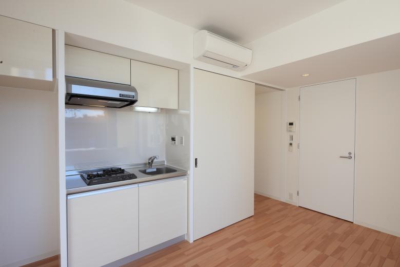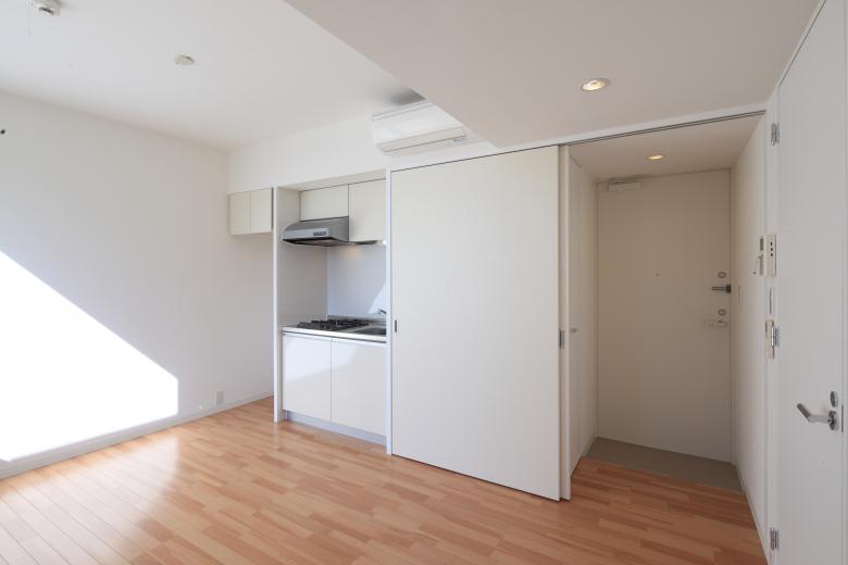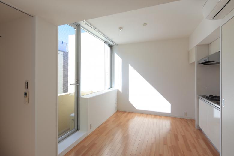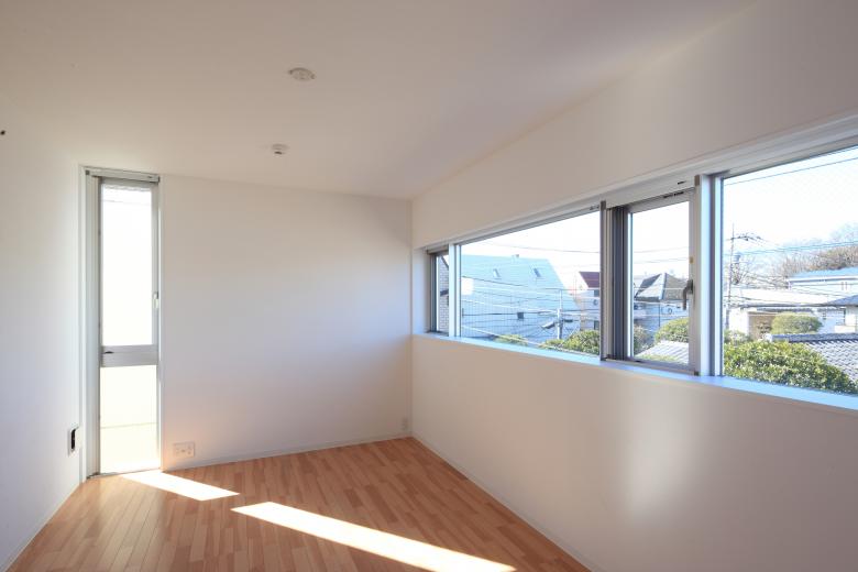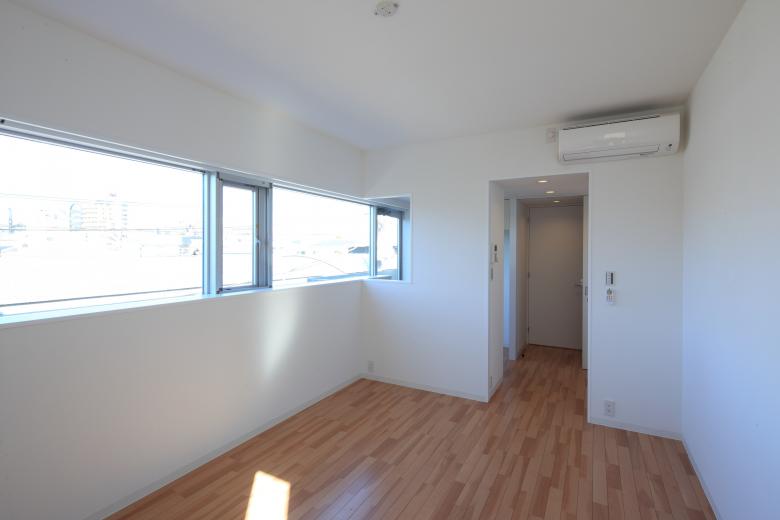 The units on the second and third floors facing the road to the west draw in the expansive external landscape through a series of horizontal windows running continuously from the living area to the kitchen. Combined with the light and breeze entering through the vertical openings on the south side, this creates an atmosphere that blends a sense of secure enclosure with a refreshing sense of openness.