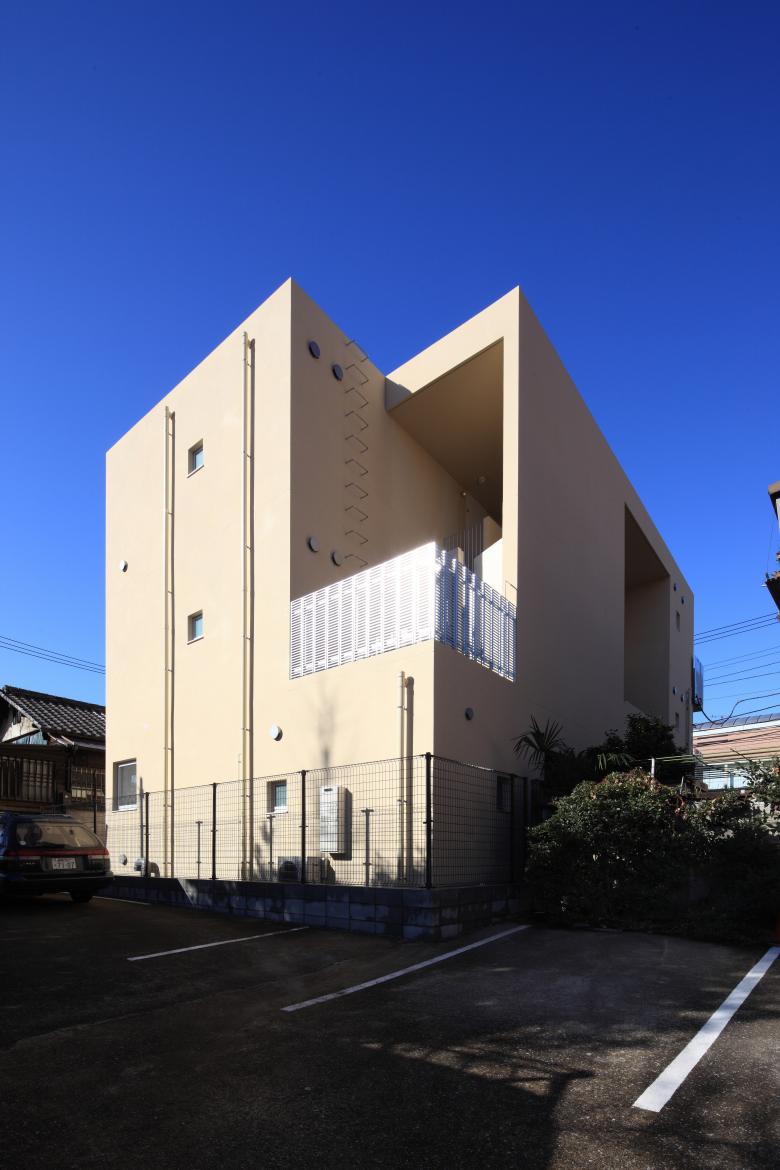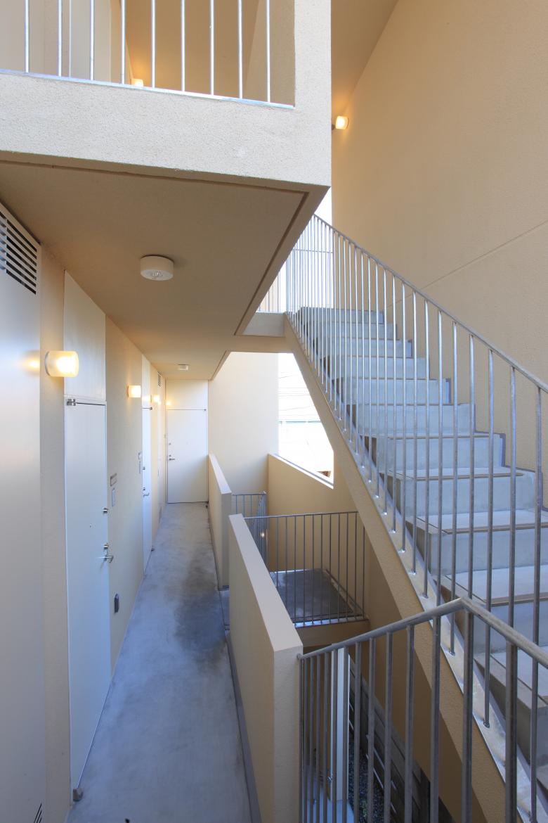 On a rectangular site extending east to west, a simple rectangular floor plan is arranged, with three units on each of the three storeys. The covered communal corridor and external staircase are compactly situated on the north side.