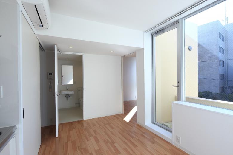 The south-facing units on the second and third floors feature an L-shaped layout with a balcony situated in a recessed section of the external wall. Despite the limited floor area, this design allows the bedroom and living areas to be both connected and distinct, introducing variety into daily life. From the living area, one can gaze out at the expansive scenery through a large opening set into the recessed section of the exterior. The serene bedroom, which draws in refreshing light and air through its tall, vertical openings, can be freely divided into separate spaces or joined together to form a single room using sliding doors.