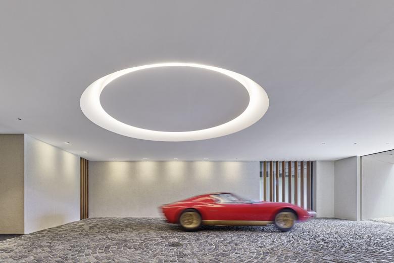 Markante Geometrien, unterschiedliche Maßstäbe und Materialkontraste erzeugen inspirierende Alltagserlebnisse, während die formale Klarheit Raum für Ruhe und Kontemplation lässt. Im obersten Geschoss ruht ein leichtes, mit Holz verkleidetes Volumen auf einem gehämmerten Betonkörper. Das Untergeschoss ist in das Gelände eingelassen und verbirgt unauffällig eine Garage für vier Fahrzeuge.