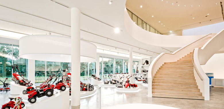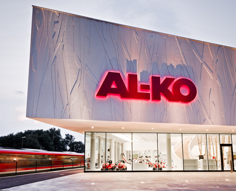 Die drei Unternehmensbereiche der ALKO Gruppe präsentieren ihre Fachkompetenz aus Gründen der Synergie gemeinsam in einem neuen KundenCenter. Ein schwebender Baukörper mit abstrahierter CI Textur in Beton beherbergt Produktausstellungen, Schulungsräume, Service und Kundenbereiche.