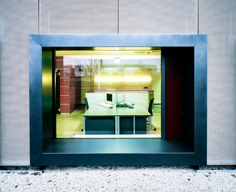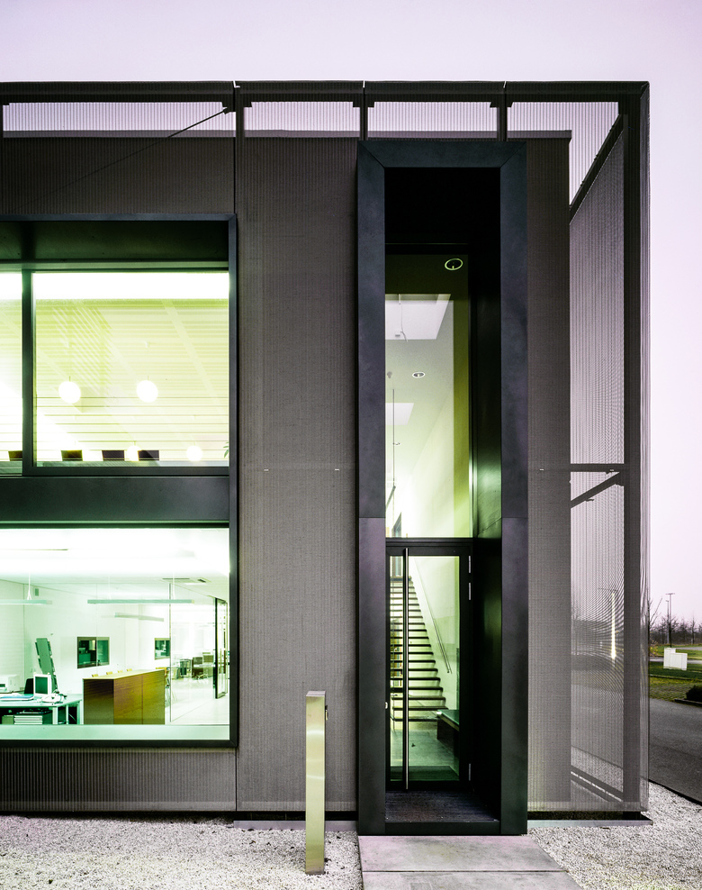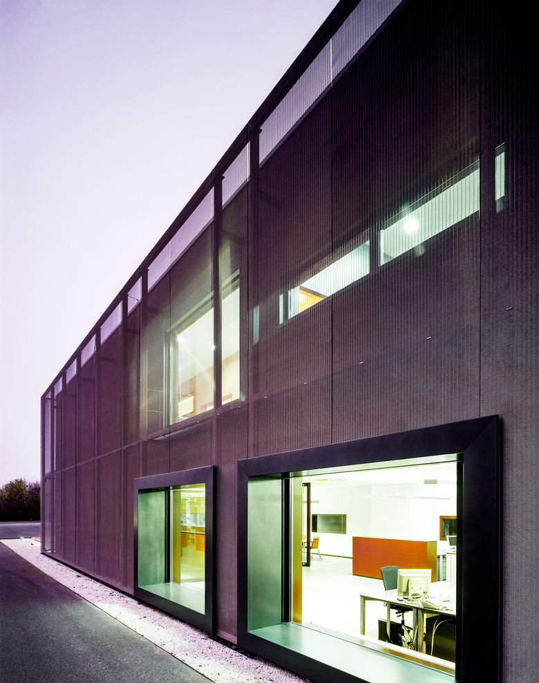 Erweiterung und Neugestaltung einer gesichtslosen Produktionshalle zu einer modernen Werksanlage mit Verwaltungsgebäude, SchulungsCenter und Logistik. Offene Raumabfolgen und transparente Übergänge zwischen Verwaltung und Produktion unterstützen die interne Kommunikation des erfolgreichen Unternehmens. Eine vorgehängte Netzfassade aus Edelstahl überspielt den Übergang zum Altbau und verleiht dem Gebäude ein technisch präzises Erscheinungsbild.
