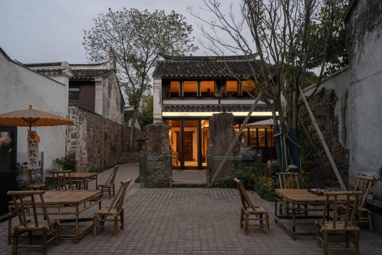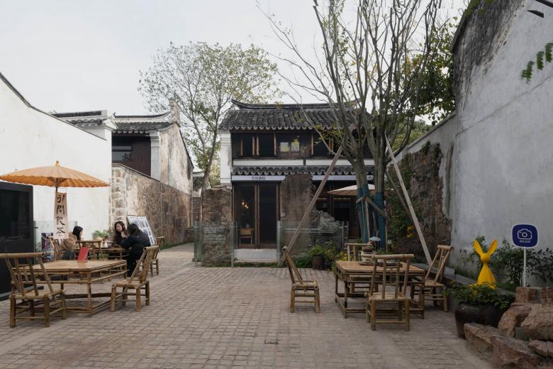 前院空间原是建筑的厅堂,倒塌后形成了较为开阔的院落空间,现在作为酒馆的的外摆区。