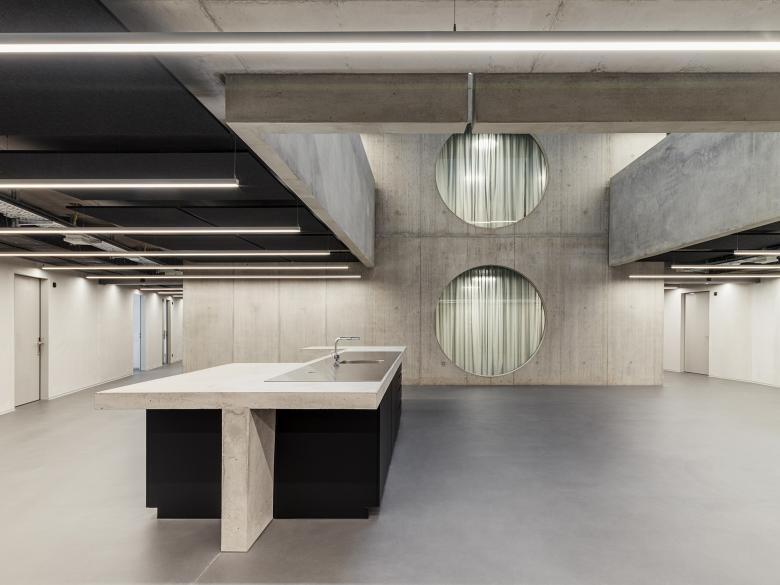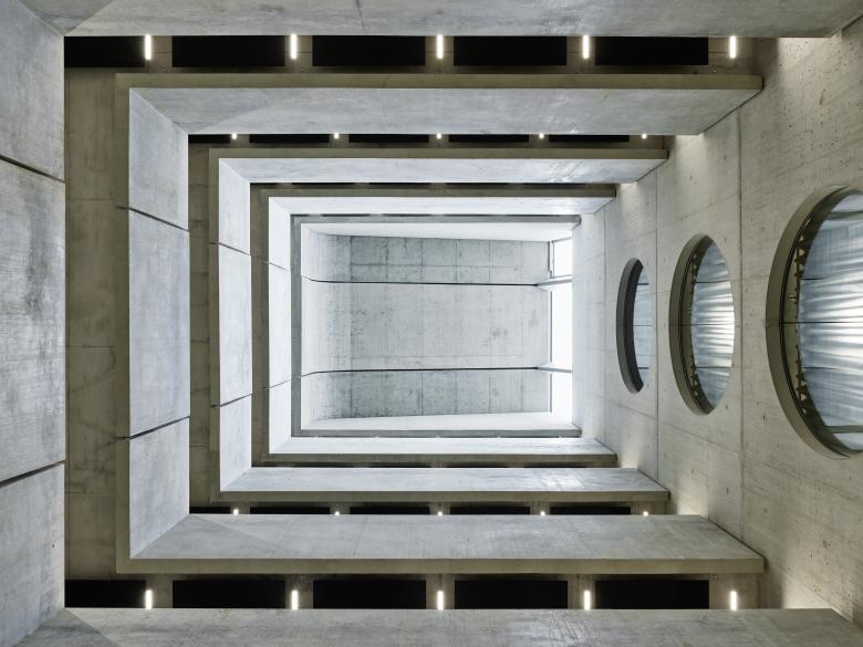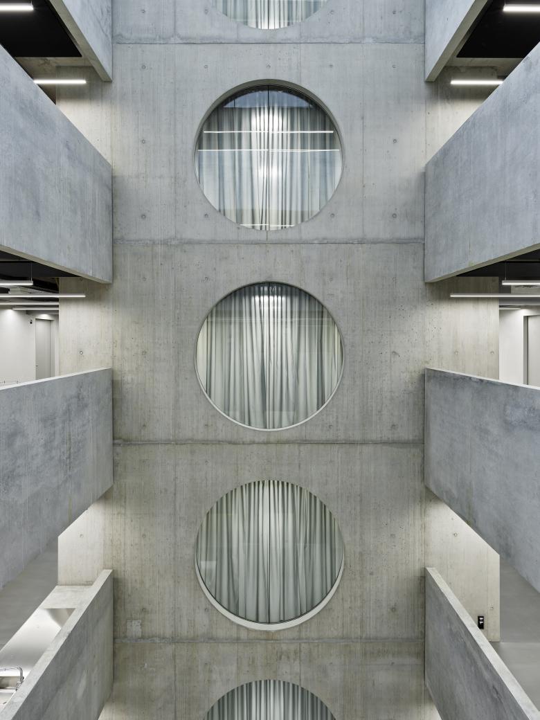 Zur Förrlibuckstrasse kragt das Gebäude aus und schafft mit dieser Geste einen repräsentativen, gedeckten Eingangsbereich, von dem aus man zum öffentlichen Showroom und Detektivbüro sowie zum Erschliessungskern gelangt. Auf der gegenüberliegenden Rückseite des Hauses liegt der separate, überwachte Zugang zu den Einvernahmeräumen und der Haftstrasse mit den Arrestzellen. In den Obergeschossen sind die tageslichtorientierten Büroräume für 370 Mitarbeitende der Fassade entlang um einen zentralen, lastabtragende Kern angeordnet, der das Rückgrat des Gebäudes bildet. Darin verbindet ein Atrium die Obergeschosse miteinander und schafft einen übergreifenden, identitätsbildenden Innenraum, der sowohl der Orientierung innerhalb des Gebäudes dient, Begegnungszonen schafft und massgeblich zur bewegten, offenen Grundstimmung des Hauses beiträgt. Im obersten Geschoss befindet sich die Cafeteria mit grosser Terrasse als ein besonderer Ort der Begegnung und der Aussicht für die Mitarbeitenden.