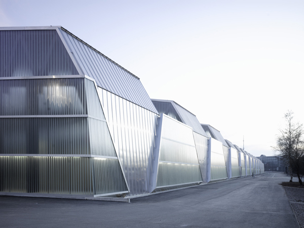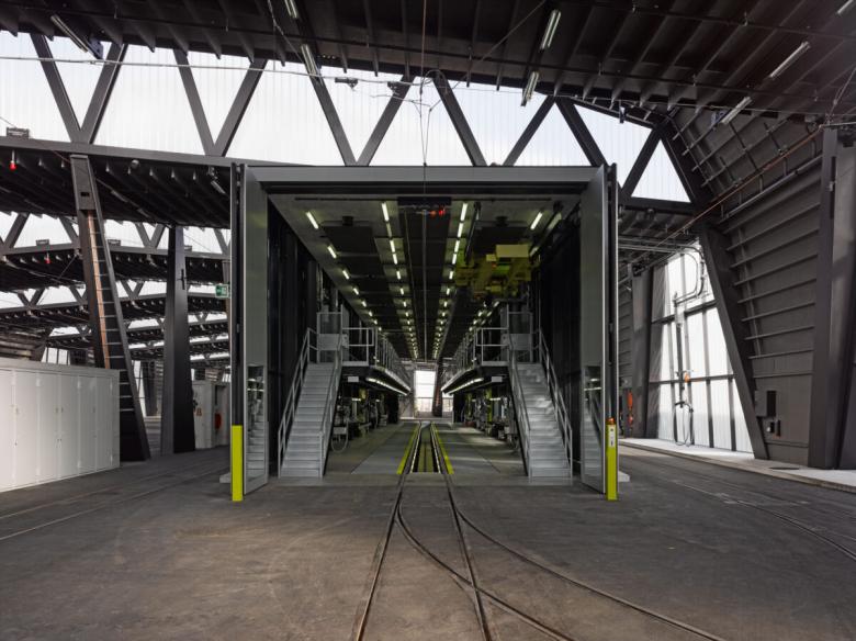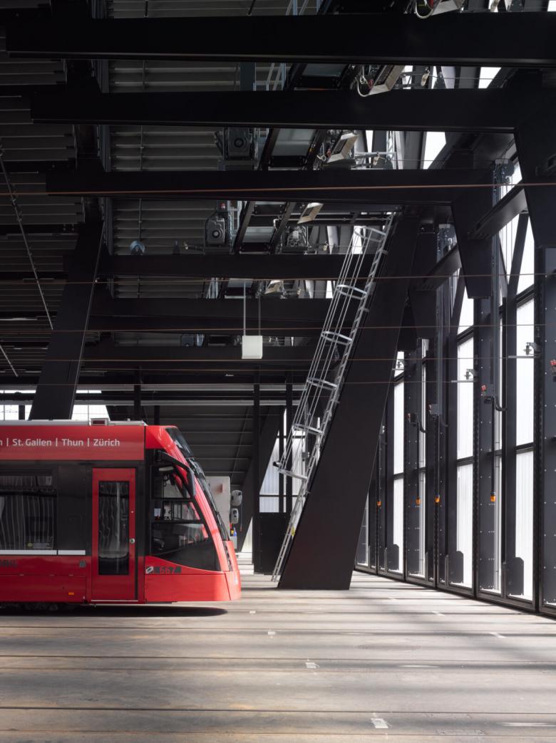 Das äussere Erscheinungsbild der Halle wird geprägt durch die Leichtigkeit der Glas-Aluminiumhülle. Die roten Tramzüge und Signale schimmern schemenhaft durch die transluzente Fassadenverkleidung der grossen Halle. Das aus Linien und Streben zusammengesetzte Tragwerk wird von einer metallisch-gläsernen Hülle überspannt, die dem Bauwerk einen plastischen Ausdruck verleiht.