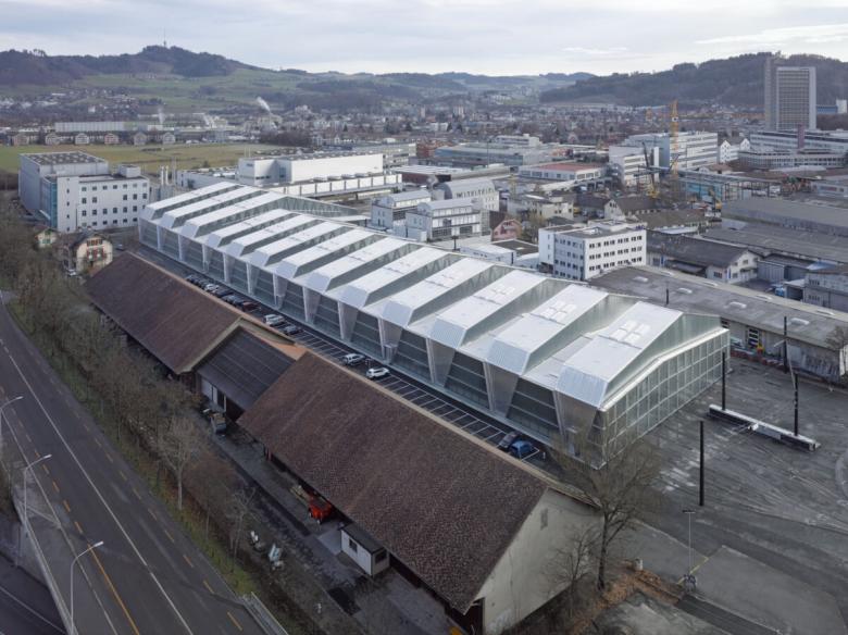 Zur Längsaussteifung sind die inneren und äusseren Stützen V-förmig angeordnet. Sie bilden sich als gestaltergebendes Grundmotiv in Struktur und Rhythmus der Fassade ab und prägen damit die Gesamterscheinung des Gebäudes. Die statische Höhe der Querträger resultiert aus den stützenfreien Erweiterungsmöglichkeiten der Halle. Für die Ausbauetappen können die bestehenden Fassaden demontiert und die Fachwerkträger verlängert werden.