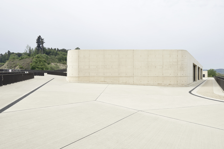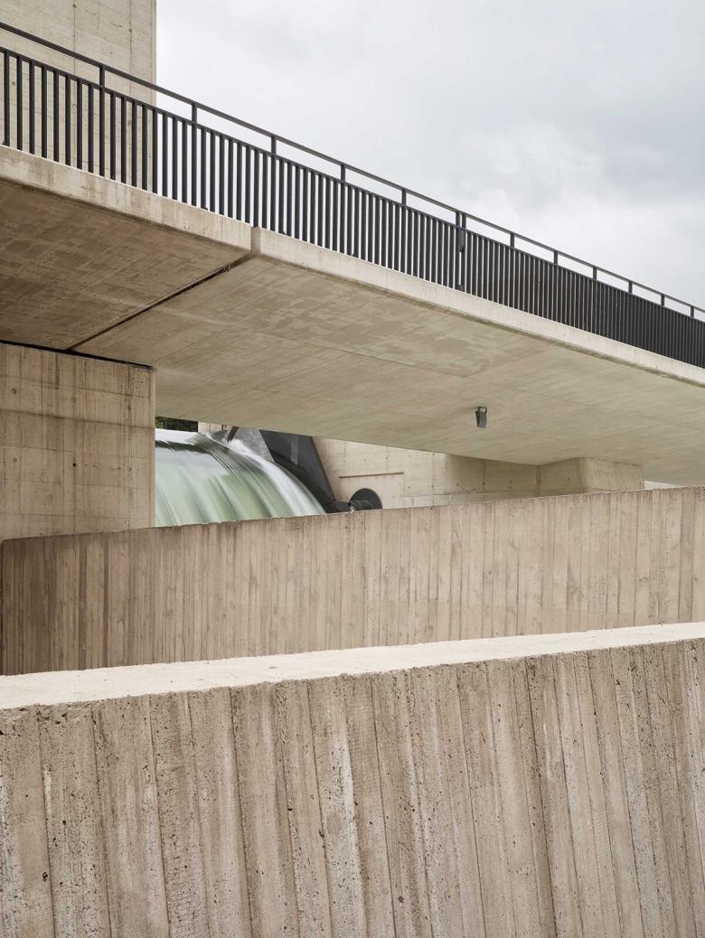 Durch die Einfärbung des Betons in einen erdigen, ockergelben Ton, der sich von der Farbstimmung her dem umliegenden Jurakalk nähert, versinken die schweren Betonmassen bildhaft im Untergrund, verbinden und verzahnen sich mit ihm und erwachsen daraus als Teil der Landschaft. Monochrom, aber mit einer Abstufung in der Schalungstextur von roher Brettschalung mit wechselnden Brettbreiten bis zu einem geordneten System von glatten Schaltafeln wird der Übergang von den landschaftlich eingebetteten Stützwänden und Leitmauern zu den grossen Wehrpfeilern, die den Flussraum rhythmisch teilen, nachvollzogen und gegliedert. Abgerundete Kanten unterschiedlicher Radien lassen die kräftige Wehranlage zugleich weich erscheinen, wie Steine, die schon geraume Zeit durch die Kraft des Wassers geschliffen worden sind.