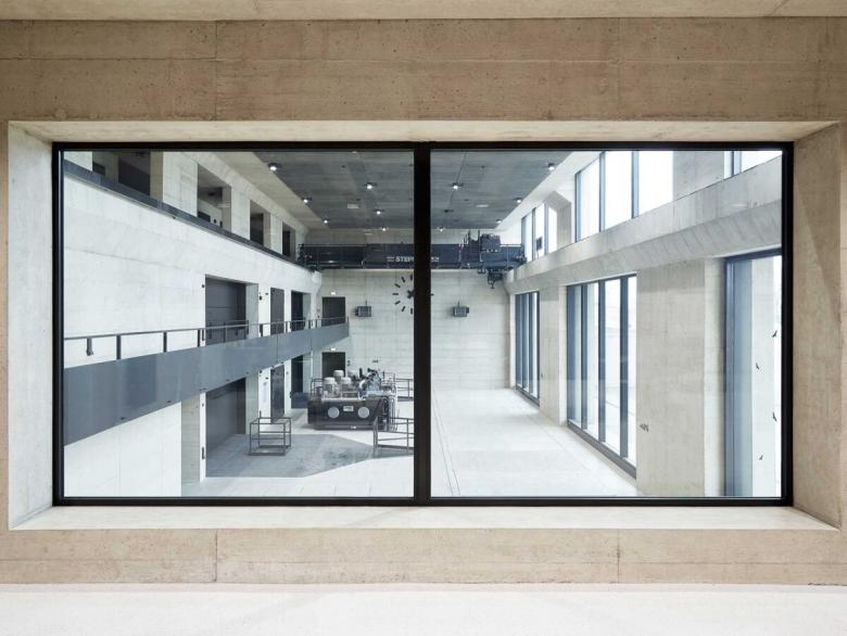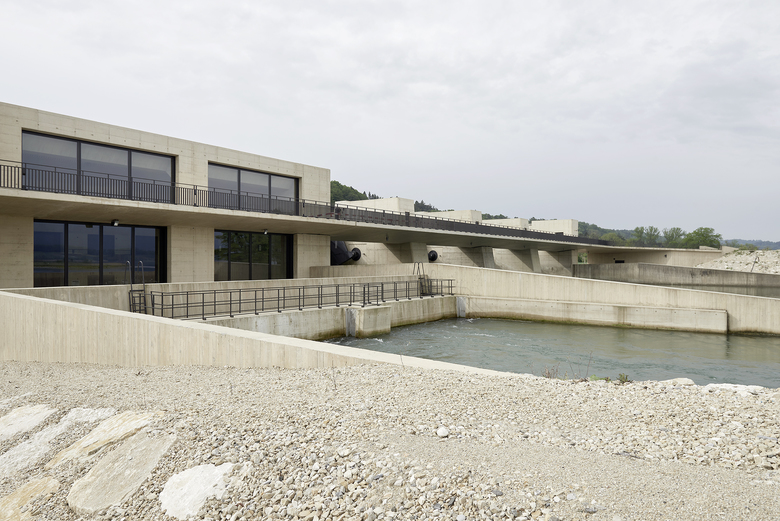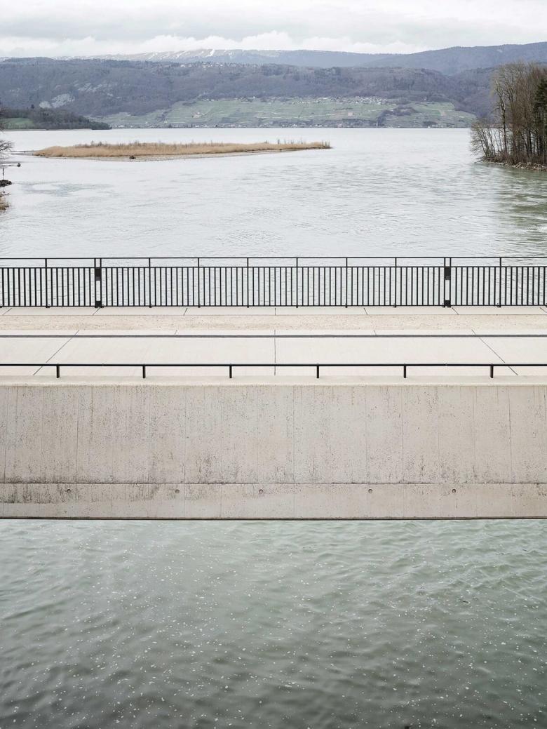 Die Architektur des Kraftwerkes verdichtet die unterschiedlichen technischen, volumetrischen und räumlichen Aspekte zu einer grossen Figur, einer Plastik im Landschaftsraum. Durch das Absenken der Wehrbrücke wurde zugleich die horizontale Dominante entscheidend nach unten genommen und die Terrainanschlüsse an den beiden Ufern mit allen hierfür notwendigen Böschungen und Stützmauern deutlich tiefer gehalten. Der Eingriff in die weite, flache Auenlandschaft konnte so sanft und flach gehalten werden, was gerade für die Panoramawirkung der Anlage auf die Weite des Sees von Bedeutung ist.