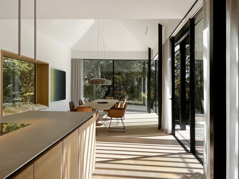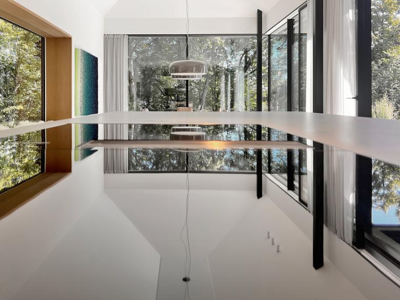 Villa Wolfrat is located in a quiet corner of Munich and blends harmoniously into its natural surroundings. Surrounded by the green, with old trees, the villa opens up to nature. A natural pond reflects the property and invites you to relax. The villa itself offers large window fronts, which ensure that light can flow into every corner and offer breathtaking views of the green oasis. The heart of the house is a spacious living area with an inviting sitting window that opens up to nature. Here, the boundaries between inside and outside merge and you feel as if you are sitting in the middle of the garden. The villa has a well thought-out “His and Hers” layout that offers both residents personal retreats without disturbing the harmony of the overall concept. In this villa, nature and modern luxury are in perfect harmony.