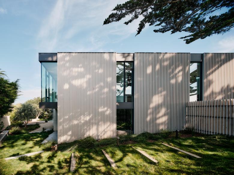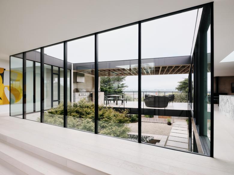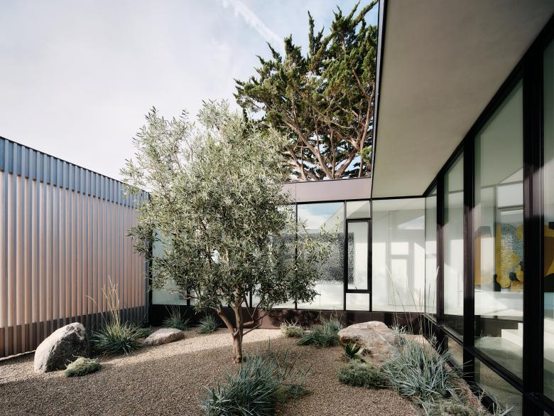 Interior courtyards are defined by floor-to-ceiling glass and white concrete block walls that in concert capture the interplay of light and shadow. The minimal aesthetic extends to the landscape, leveraging the native environment while introducing elements found with its contextual surroundings.