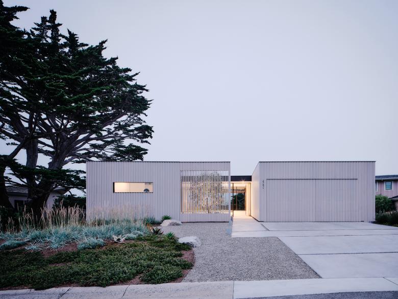 Upon first glance, this Carmel home resembles a simple single-story box. The cedar-clad exterior facade is subtly accentuated by vertical glazing strips while the home’s entryway transitions through a tranquil interior courtyard.