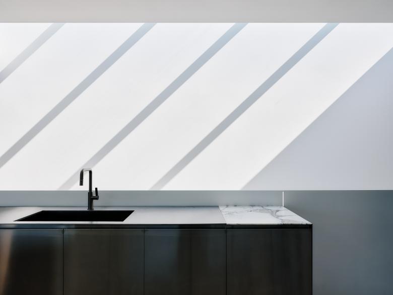 Once inside, the house diverges into a series of open and connecting upper and lower wings that mimic the lot’s angles—optimizing seaside views as well as spatial separation. Bridging elements connect these sections, unifying private and communal areas and enhancing the indoor-outdoor living experience throughout.