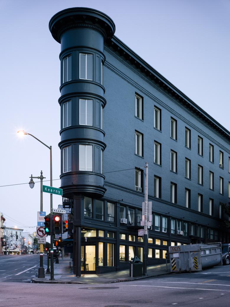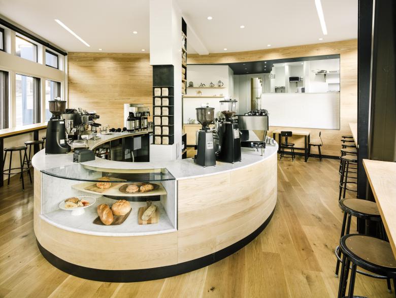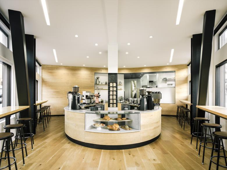 Tucked into the narrow ground floor of the flatiron corner building between Kearny and Columbus Streets in San Francisco’s North Beach neighborhood, the Reveille Coffee House carefully balances light and dark, round and sharp. A circular marble-topped counter in the middle of the space creates smooth movement patterns in the shop while contrasting the distinctively pointed footprint of the building. As light enters through the long rows of windows on either side of the space, it bounces off the space’s bright surfaces and onto the light wood, creating a gentle, warm glow throughout. Meanwhile, dark metal elements cut a bold profile against this light warmth; structural cross-bracing along the long sides of the space is finished in a matte black, as are the chairs, stools and counter surfaces.
