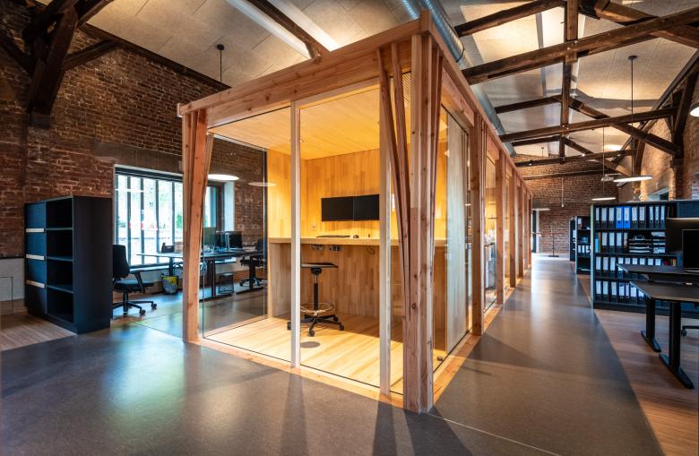Der ursprünglich als Werks- und Verkaufshalle genutzte Güterbahnhof in Remagen wurde in umfangreichen Umbau- und Sanierungsarbeiten in ein modernes Büro umgestaltet. Das Gebäude fügt sich in die Umgebung ein und wirkt klar als Einheit nach außen. Die besondere Struktur der Holzfassade, die einer Welle nachempfunden ist, vermittelt die Leidenschaft von PIRMIN JUNG für den Baustoff Holz. Die energetischen Maßnahmen setzen auf Nachhaltigkeit und erreichen einen möglichst hohen Autarkiegrad. Durch den Mix aus viel Holz und den erhaltenen, sichtbaren Backsteinmauern wurde innen eine ganz besondere (Arbeits-)Atmosphäre geschaffen. Eine Auralisation im Vorfeld ermöglicht ein durchdachtes Raumkonzept, das ein ruhiges und konzentriertes Arbeiten ermöglicht, ohne den Sichtkontakt zu verlieren. Für genügend Rückzugsorte, in denen die Mitarbeitenden bei Bedarf ungestört arbeiten können, ist gesorgt.