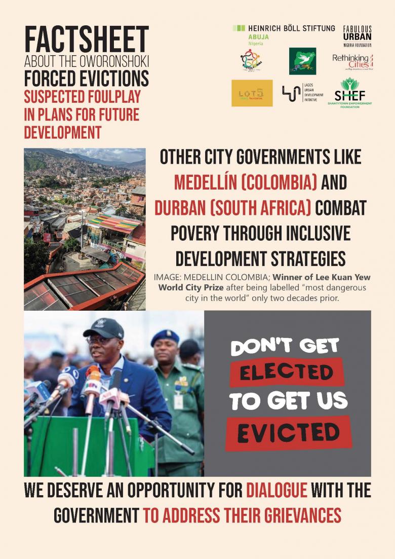 In collaboration with other NGOs, we continue the advocacy for the slum dwellers in all Oworonshoki. Partner organizations include: Rethinking Cities, Shantytown empowerment foundation, CEE-Hope, Oworo Youth forum, Lot5 Charity foundation, Lagos Urban Development Initiative, and Heinrich Böll Stiftung Abuja.