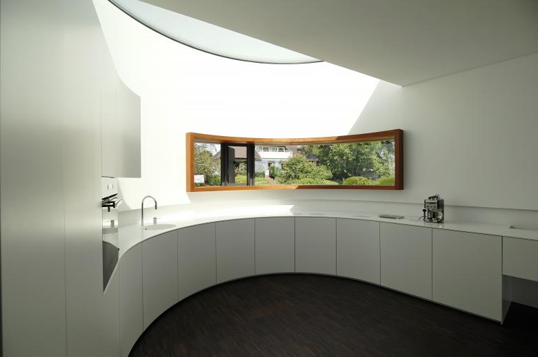 Wunsch des Bauherren war es über den Dächern der Stadt zu wohnen. Es sollte ein offenes Wohnkonzept sein, welches zugleich Rückzugsmöglichkeiten bietet. Im Erdgeschoss befindet sich der Eingang, Garderobenbox, Schlafbereich mit Ankleide und Bad sowie Kinderzimmer. Durch Schiebetüren können die einzelnen Bereiche voneinander getrennt werden. Der Verlauf der geschwungenen Gebäudehülle ist im Inneren an jeder Stelle erlebbar. Die Wohnebene mit großer Dachterrasse im Obergeschoss bildet den Lebensmittelpunkt. Hier befindet man sich auf dem höchsten Punkt der Anhöhe und hat einen wunderschönen Blick über die Stadt und den Horizont. Der Innenraum wird mit natürlichem Licht durchflutet. Die definierten Dachüberstände verhindern eine Überhitzung im Sommer. Die kraftvolle Geometrie fast die Terrasse und den Innenraum räumlich zusammen.