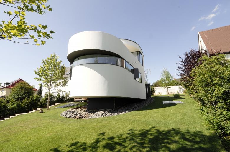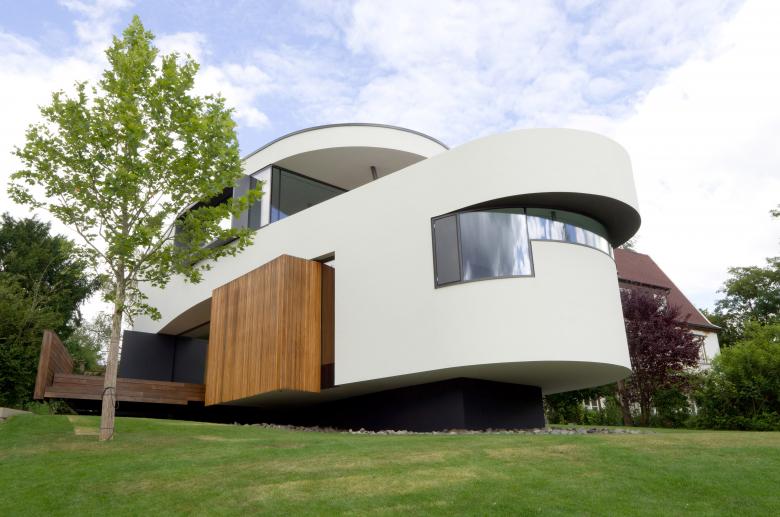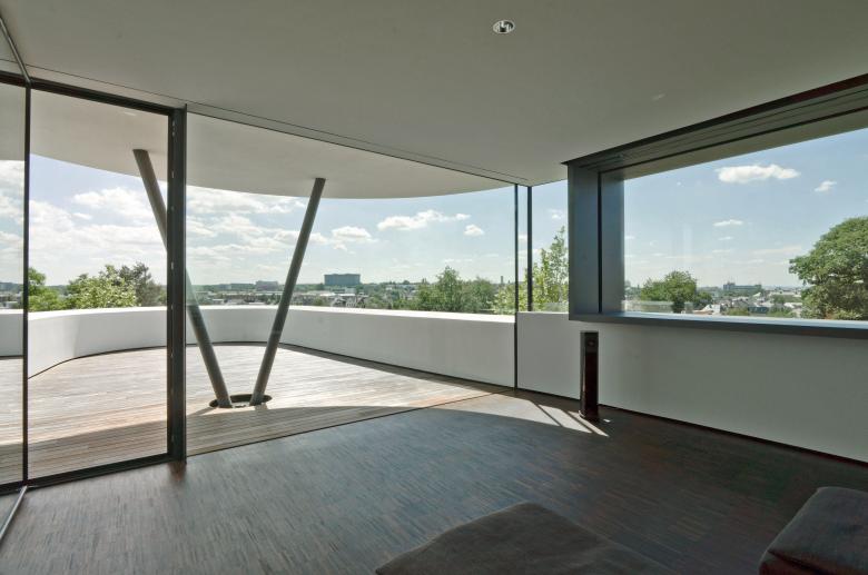 Auf einer Anhöhe mit viel Grün und unmittelbarer Nähe zum Stadtzentrum, in einer städtebaulich heterogenen Umgebung, entwickelt sich eine lebendige individuelle Wohnarchitektur. Die weiche organische Formensprache sowie die präzise Anordnung architektonischer Elemente erzeugen eine kraftvolle Plastizität. Mittelpunkt ist das Wohnen über den Dächern der Stadt. Die raumhohen Verglasungen, die große Terrasse, das Tageslicht sowie der Fernblick erzeugen intensive, emotionale Raumstimmungen und eine hohe Aufenthaltsqualität.