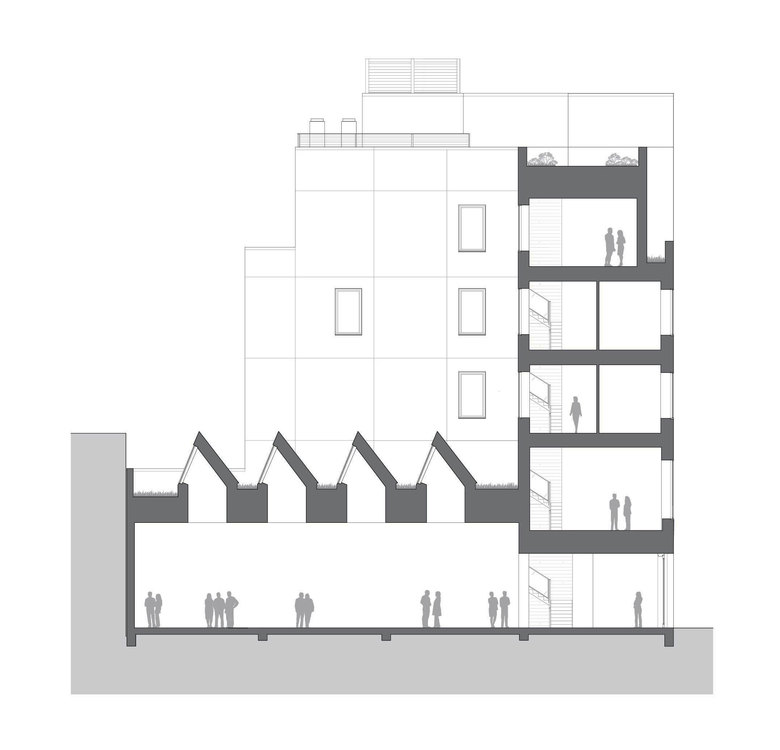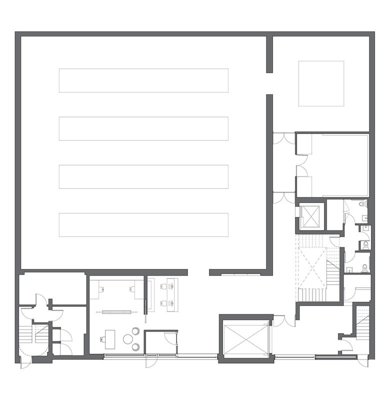 Exhibition space continues on the second floor with a more intimate 2,000 sf gallery with oak floors. Levels three, four, and five accommodate private functions such as viewing rooms, offices, and art handling areas. Concrete is utilized on the interior to create a dramatic stairwell connecting all five floors. The LEED Gold project incorporates environmentally-conscious strategies such as five green roof spaces, premium efficiency mechanical and lighting, maximized daylighting, and locally and responsibly-sourced materials.