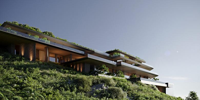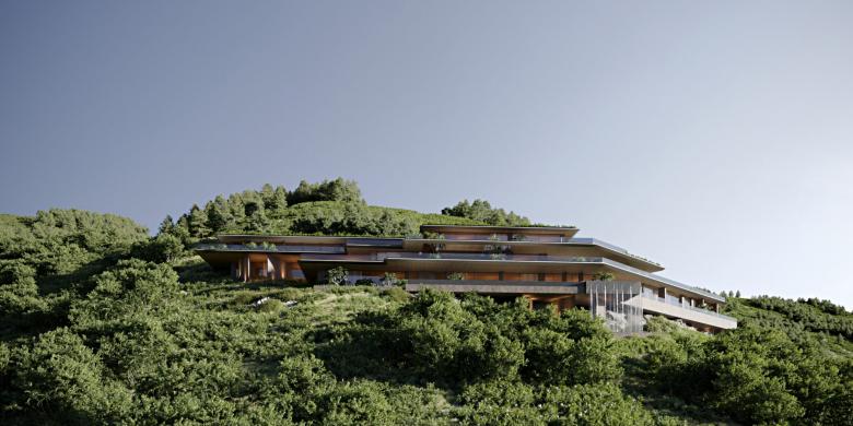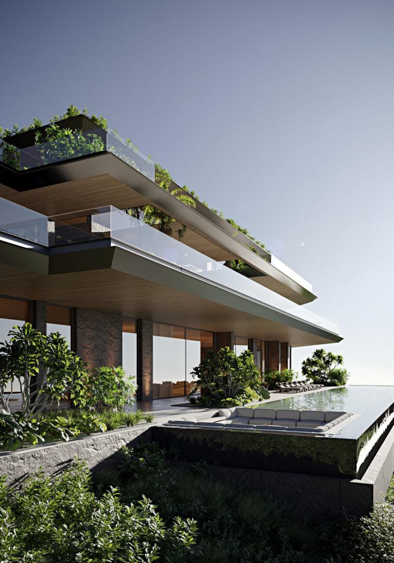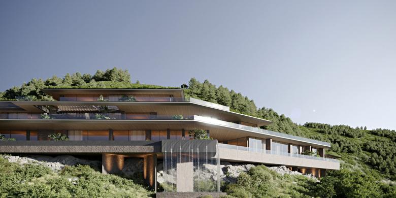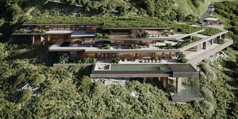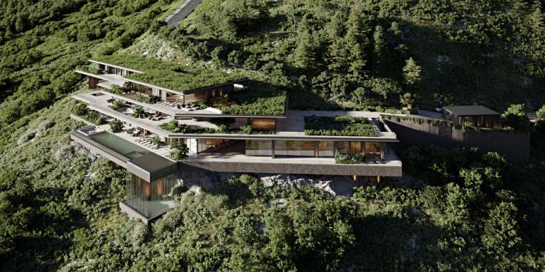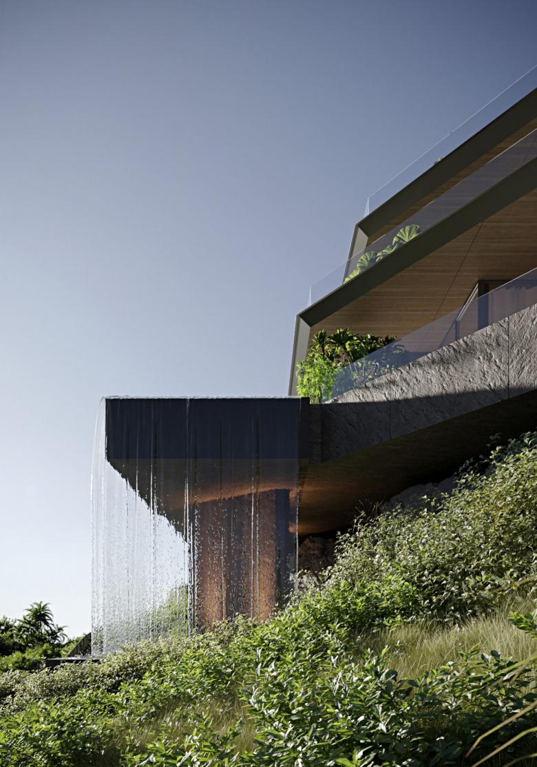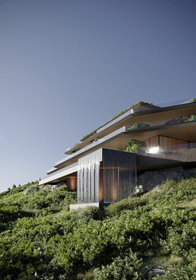 This architectural project on the intricate slopes of a breathtaking Portuguese island aimed to harmonize uniqueness with the location's natural essence. The villa's layout carefully preserved the vistas through expansive terraces and panoramic windows, utilizing cascading floors. The Falls Villa concept further incorporated water features, like a basement waterfall, while the villa's rooftop greenery rendered it nearly concealed when seen from above. Materials, including warm woods, slate stone, bronze details, and extensive glass, were chosen to honor the locale's character.