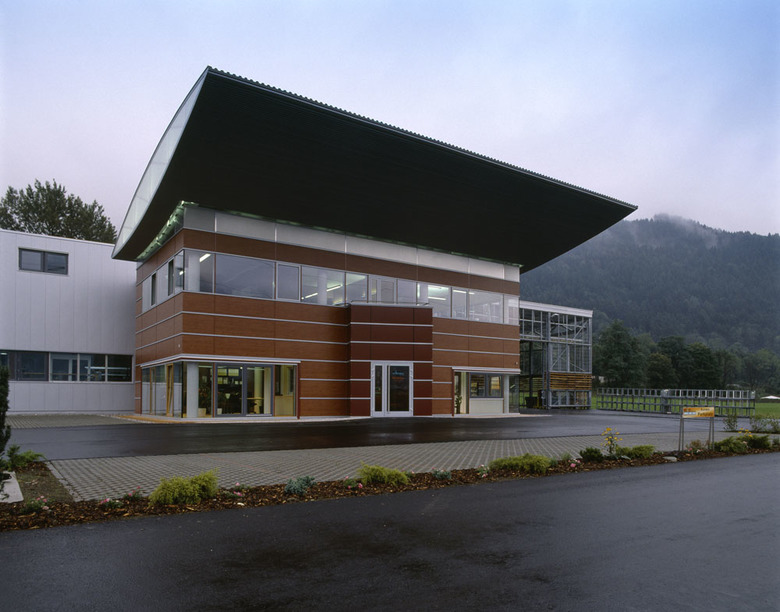 Das zweigeschossige Bürogebäude beherbergt im Erdgeschoss Schauräume, Verkaufsräume und Büros. Über eine markante Eingangsbox betritt man das zweigeschossige Gebäude und kommt in einen nach drei Seiten offenen Raum. Neben dem Schauraum sind im Erdgeschoß auch Verkaufs- und Büroräume untergebracht. Im Obergeschoß befinden sich Personal- und Seminarräume. An den Seitenflächen der Fassade bilden Holzleimbinder die Rahmen zur Präsentation der Fenster und Türen.