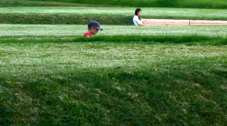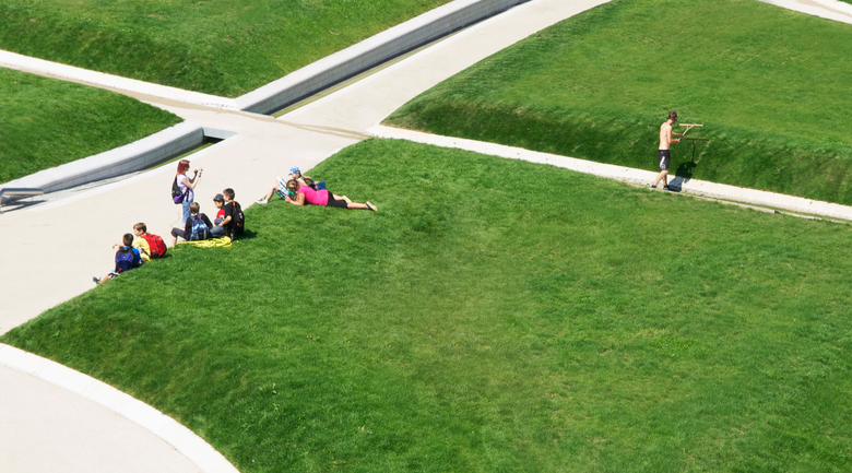 Spielen im Park – Der Park als Plattform – Der Park mit seiner Topographie kann als großer Spielplatz verstanden werden. Topographie – Rennen und Hüpfen auf dem Wegenetz und über die bewegte Landschaft übt eine große Faszination für Kinder aller Altersgruppen aus. Neben diesem flächenübergreifenden Spielangebot kann auf den Rasenkissen, die in großen Teilen die Fläche von Kleinspielfeldern aufweisen, Ball, Federball, Frisbee u.a. gespielt werden. Der Wasserlauf mit seinen unterschiedlichen Aufweitungen und Fließgeschwindigkeiten übt eine weitere Faszination auf Kinder aus. Für die Akademie der bildenden Künste können Einz