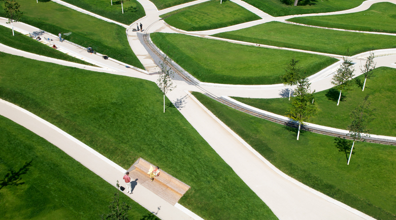 Aber es entsteht auch eine Landschaft, die von der gekonnten Illusion lebt. Die Verfremdung der gewohnten Umgebung durch die Anhebung der Topographie und dazwischen eingeschnittene Wege, erzeugt ein überraschendes Spiel mit der Wahrnehmung von Raum und dem menschlichen Maßstab. Einerseits die Bezugnahme auf die soziale und naturräumliche Vergangenheit des Orts in Form von Neuinterpretation des Themas Steinbruch, Wellen, Wildnis und drüber hinaus mit Hilfe der Überformung der gewohnten Sichtweisen das Auslösen neuer Sinneseindrücke, darin liegt die Innovation der zukunftsorientierten Gestaltung.