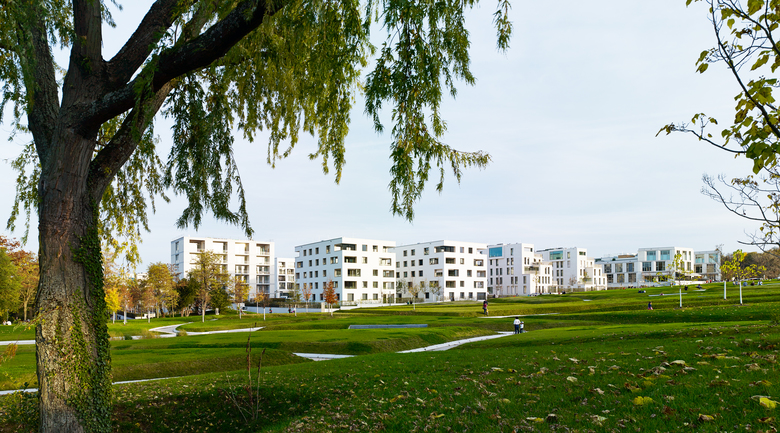 Alle Gebiete gemeinsam verbindet das Thema der nachhaltigen und ökologischen Entwicklung. So werden Flachdächer und Fassaden wenn möglich begrünt. Die anfallenden Dachwasser werden in einer Zisterne im bestehenden unterirdischen Messegebäude gesammelt, in den See abgeführt und wieder in den Wasserkreislauf eingespeist. Die Rasenkissen des Parks bilden durch ihre unterschiedlichen kleinklimatischen Bedingungen Lebensräume für unterschiedliche Flora und Fauna.