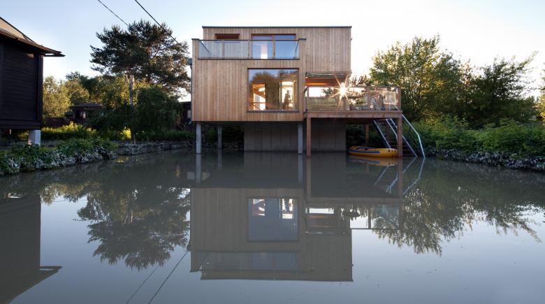 Neubau eines Wohnhäuschens auf Stelzen für eine vierköpfige Familie im Umfeld der historischen Strandbadsiedlung in Klosterneuburg. Die Lage in der Nähe zur Donau mit häufig auftretenden Überschwemmungen hat in dieser Gegend einen eigenen Gebäudetyp hervorgebracht, der als einfache und erschwingliche Bauaufgabe von jeder Generation neu interpretiert wird.