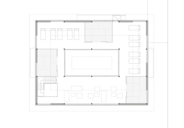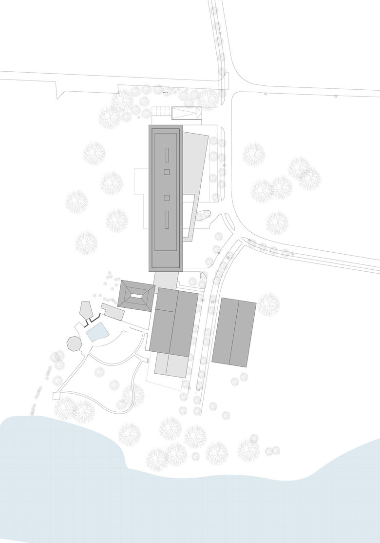 Das neue Saunahaus orientiert sich typologisch an den steinzeitlichen Pfahlbauten des Bodensees, es steht aufgeständert halb im Wasser und halb am Land. Das Gebäude ist im Stil eines Sentõs, eines japanischen Badehauses, gestaltet und soll den Gast auf eine Reise in das Reich der aufgehenden Sonnen entführen.So bildet der Onsen, ein Heisswasserbecken, in einem klimaoffenen Innenhof gelegen, das Zentrum des Gebäudes. Hierum gruppieren sich im Erdgeschoss eine Bambus- und Dampfsauna, Umkleiden sowie Waschräume u.a. mit japanischen Sitzduschen. Im Obergeschoss befindet sich Ruhezonen die gleichermassen loungeartig modern und als traditionelle Tatamiräume mit Shoji Wänden ausgebildet sind