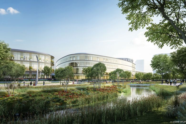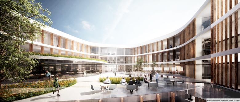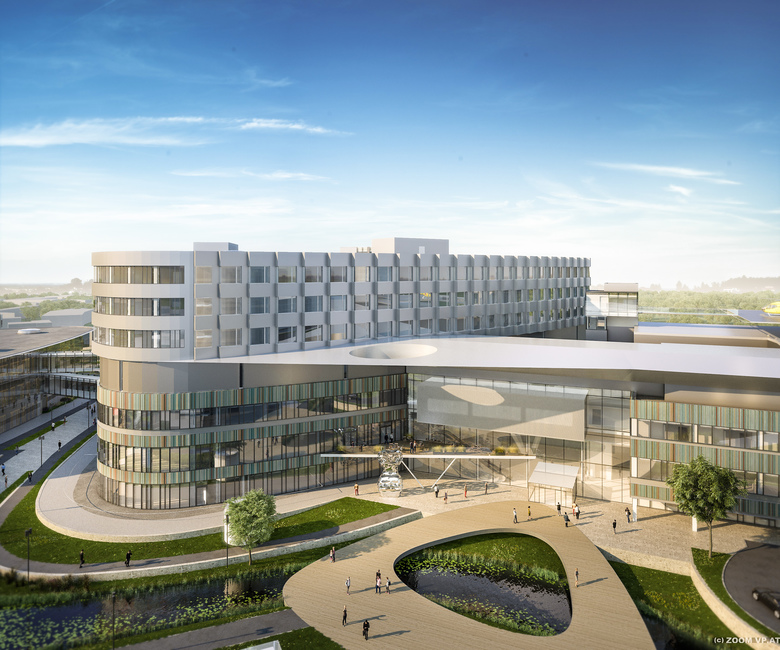 Der landschaftsarchitektonische Entwurf sieht die Schaffung eines lebendigen, harmonischen und ineinanderfließenden Wohlfühlraums vor. Der Freiraum ist in drei Themen gegliedert: die inneren Höfe des Krankenhauses, der Gesundheitspark mit seinen belebten, urbanen Grünoasen entlang der Wasserader sowie die begrünten Dächer. Diese drei Bereiche sind durch ein durchgängiges Netz aus Wegen und Verbindungen eng miteinander verbunden. Ergänzt wird das „healing environment“ durch den Einsatz natürlicher Formen, von naturnahen „healing colours“ sowie einer Auswahl von geeigneten Kunstwerken. In Verbindung mit dem Grünraum und den eigens konzipierten Gärten und Dachlandschaften entsteht ein gesamtheitlich-räumliches Empfinden, das wesentlich zum Wohlfühlen und zum Genesungsprozess beiträgt.