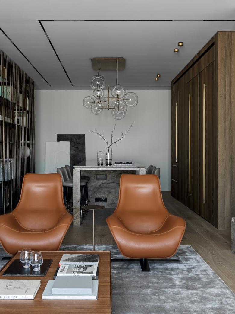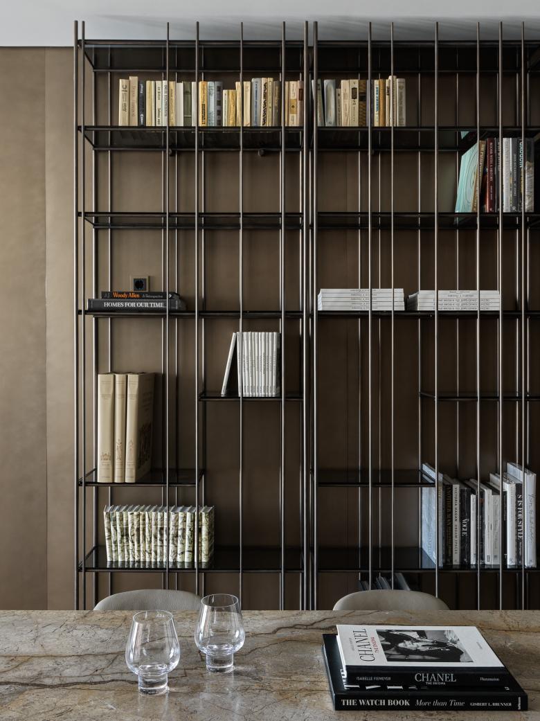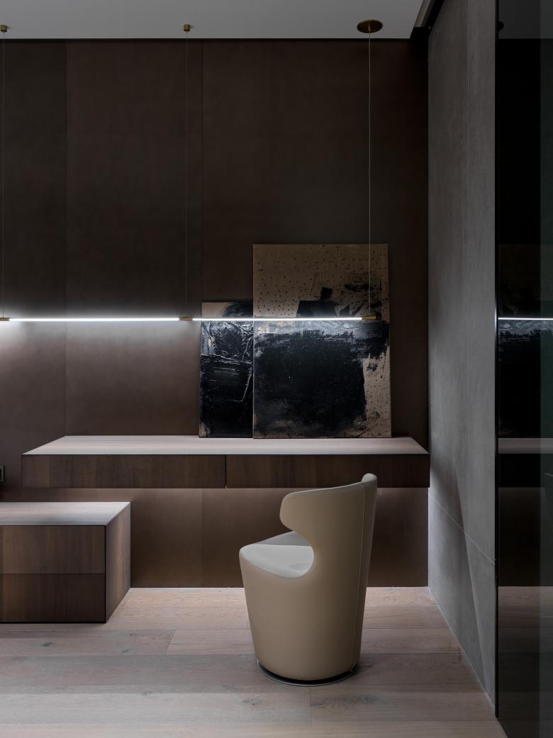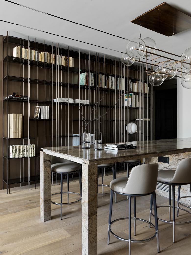 The studio has paid great attention to lines, surfaces, and their harmonious interaction in the apartment. So, one of the key ideas of this interior is a brass wall that goes through several zones of the apartment. It is mounted from the hallway through the kitchen-dining room straight to the living room. The wall set the tone for the overall concept because brass accents can be noticed in all the apartments: cabinet handles, the base of light compositions, taps, and shelves.