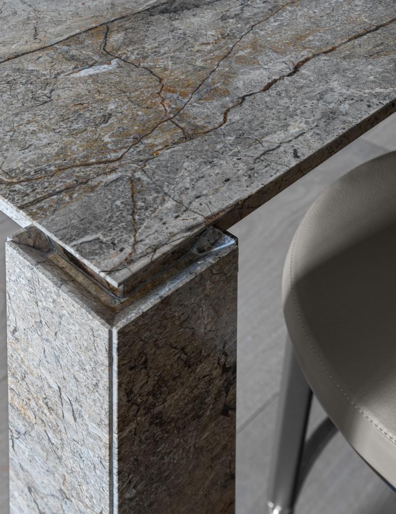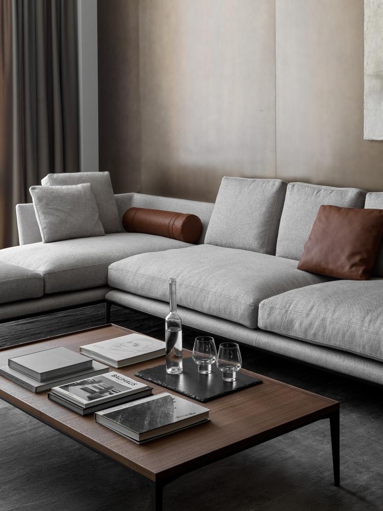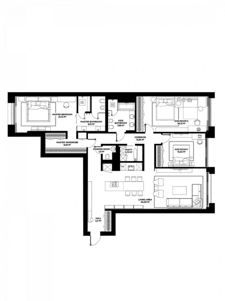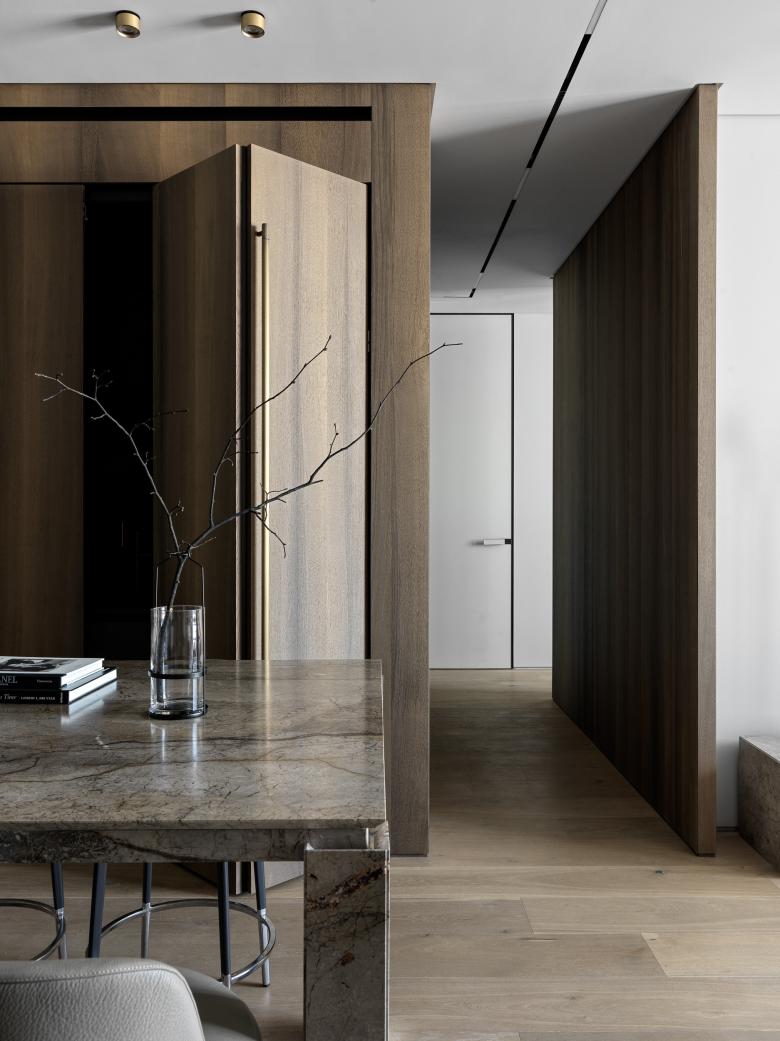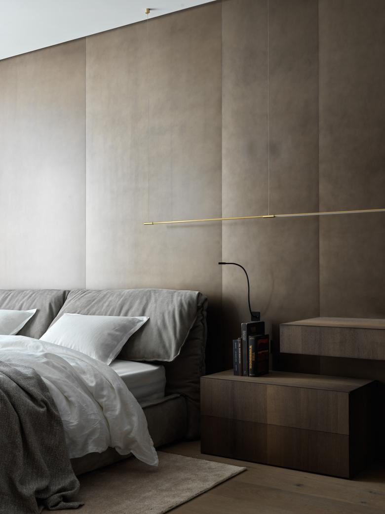 The studio has paid great attention to lines, surfaces, and their harmonious interaction in the apartment. So, one of the key ideas of this interior is a brass wall that goes through several zones of the apartment. It is mounted from the hallway through the kitchen-dining room straight to the living room. The wall set the tone for the overall concept because brass accents can be noticed in all the apartments: cabinet handles, the base of light compositions, taps, and shelves.