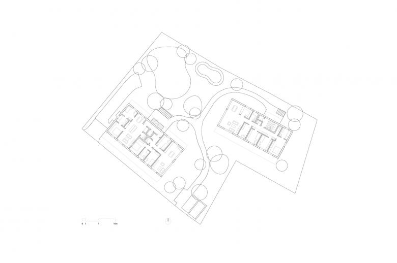 Auf zwei Geschossen und einem jeweils zusätzlichen Attikageschoss entwickeln die insgesamt acht Eigentumseinheiten luftige, lichtdurchflutete Wohnwelten – diese zeichnen sich allesamt durch grosszügige, fliessende Wohn- und Essbereiche aus sowie eigene Sichtbezüge und Verknüpfungen zum Aussenraum. Aus dieser komplexen Anforderung haben sich die vielschichtigen Grundrisse hergeleitet, welche von der durchlaufenden Balkonschicht gegliedert werden.