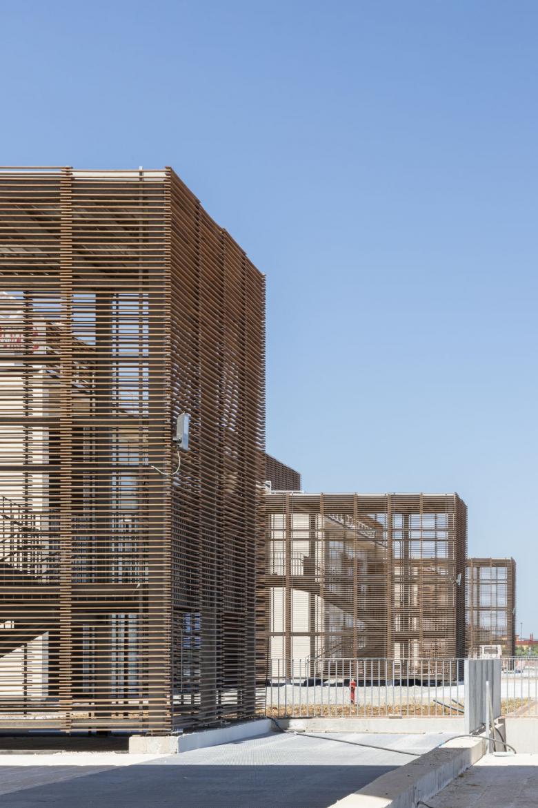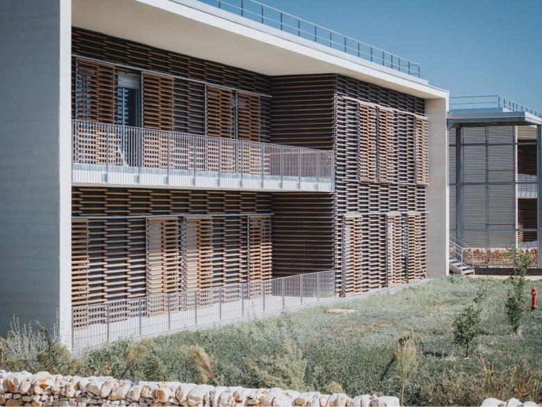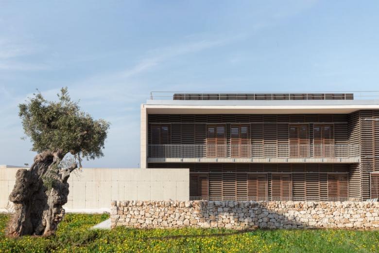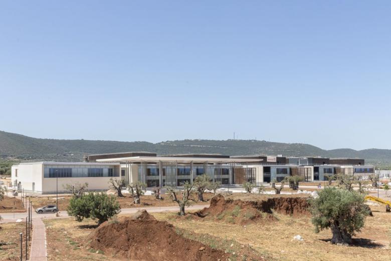 El punt de partida va ser l’anàlisi de les característiques del lloc, un paisatge d’oliveres i garrofers monumentals, així que es busca una inserció clara i coherent en el territori. L’edifici es consolida com una obra que respecta les característiques naturals del paisatge i aposta per un nou model de centre hospitalari sostenible. Es proposa llavors una edificació baixa, un únic volum format per blocs connectats a nivell funcional, encara que compositivament autònoms. Aquests blocs s’organitzen segons un esquema en forma de pinta: al cos principal, disposat segons l’eix nord-est del solar, s’enganxen volums més petits de forma perpendicular. Els buits que es creen entre els blocs es converteixen en patis que permeten la introducció del paisatge dins de l’edifici: així s’aconsegueix el màxim d’il·luminació solar i ventilació natural en les unitats d’hospitalització, i s’ofereix al pacient una alta qualitat ambiental en espais comuns, recorreguts interiors i àrees de descans. La integració física i visual de les zones verdes en tots els espais destinats a pacients interns i ambulatoris afavoreix la humanització i el control ambiental i representa un caràcter distintiu en aquesta experiència terapèutica.