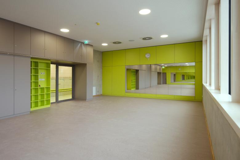Die Sporthalle wurde als kompakter Baukörper konzipiert und ist im Volumen differenziert. Der höhere Hallenbereich wird an den Längsseiten durch niedrigere Baukörper ergänzt: