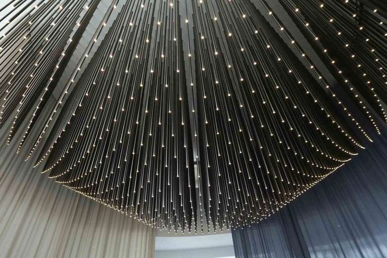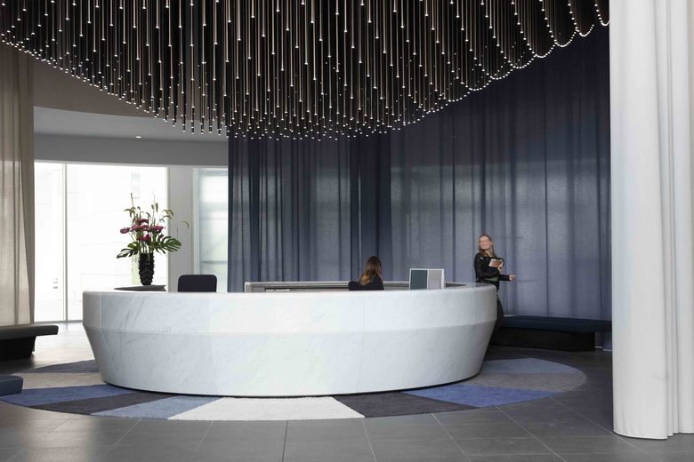 In 2018, A/W redesigned all the public areas at Siemens Headquarters, originally built in 1999 by Richard Meier. The round, 8-metre-high entrance hall now serves as a reception and lobby. The reception desk made of solid Italian Carrara marble and a blue-and-grey-coloured carpet are positioned in the centre of the lobby. Directly above and framed by floor-to-ceiling curtains is a light installation almost 10 metres in diameter with 1,200 stainless-steel interactive LED rods from the design agency Fantomas.
