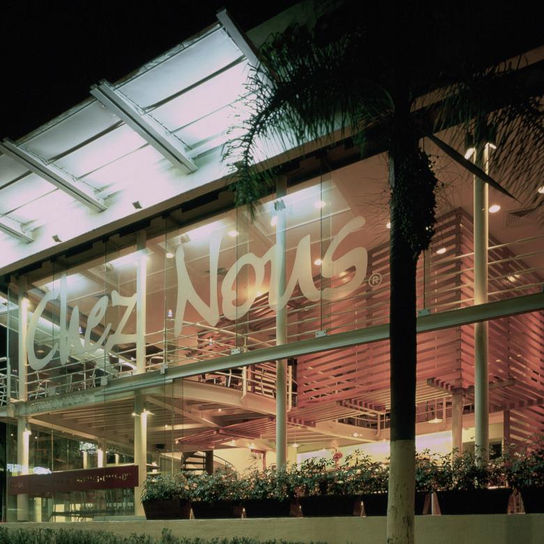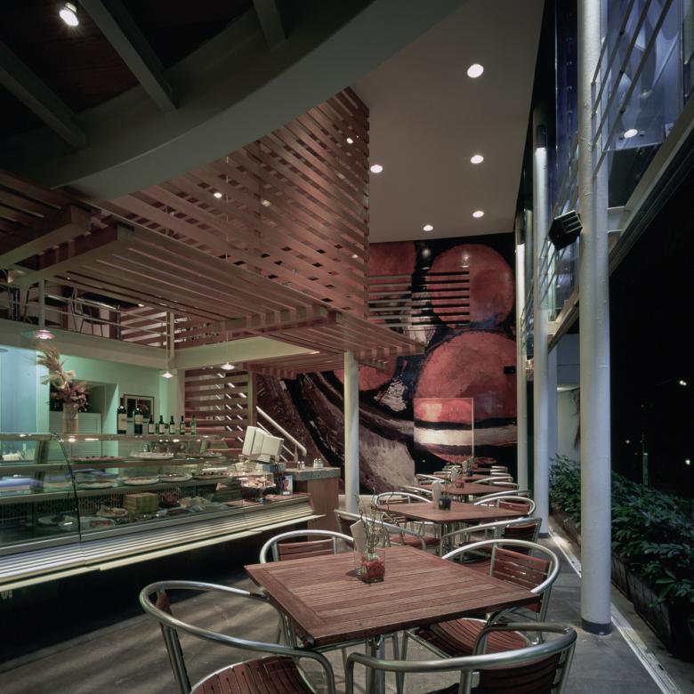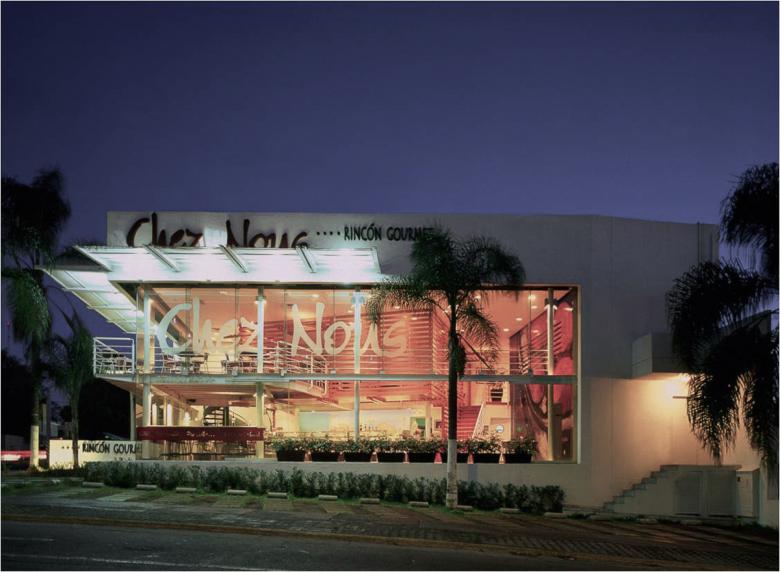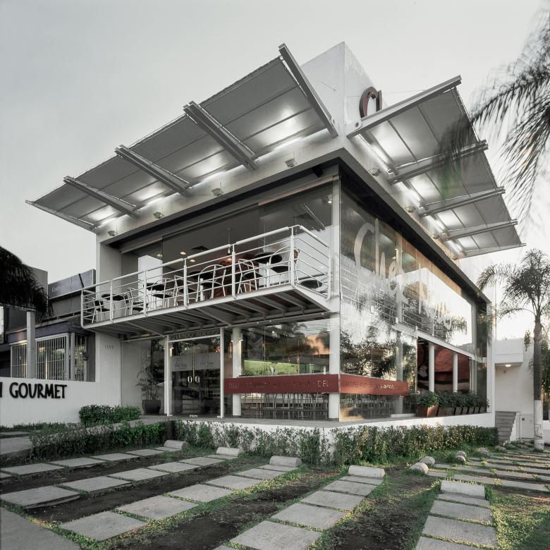 Los espacios interiores son concebidos como una secuencia de comedores y terrazas que se articulan alrededor del espacio central de preparación de alimentos. Este, es materializado en una caja de madera semitransparente que integra los espacios de escala intima con los espacios de doble altura, que respeta la privacidad y mantiene la transparencia. La caja de madera se gira sobre su eje para recibir al visitante con la vista diagonal de las vitrinas que contiene.